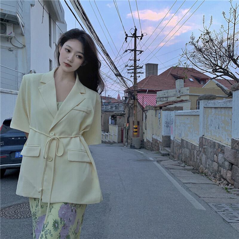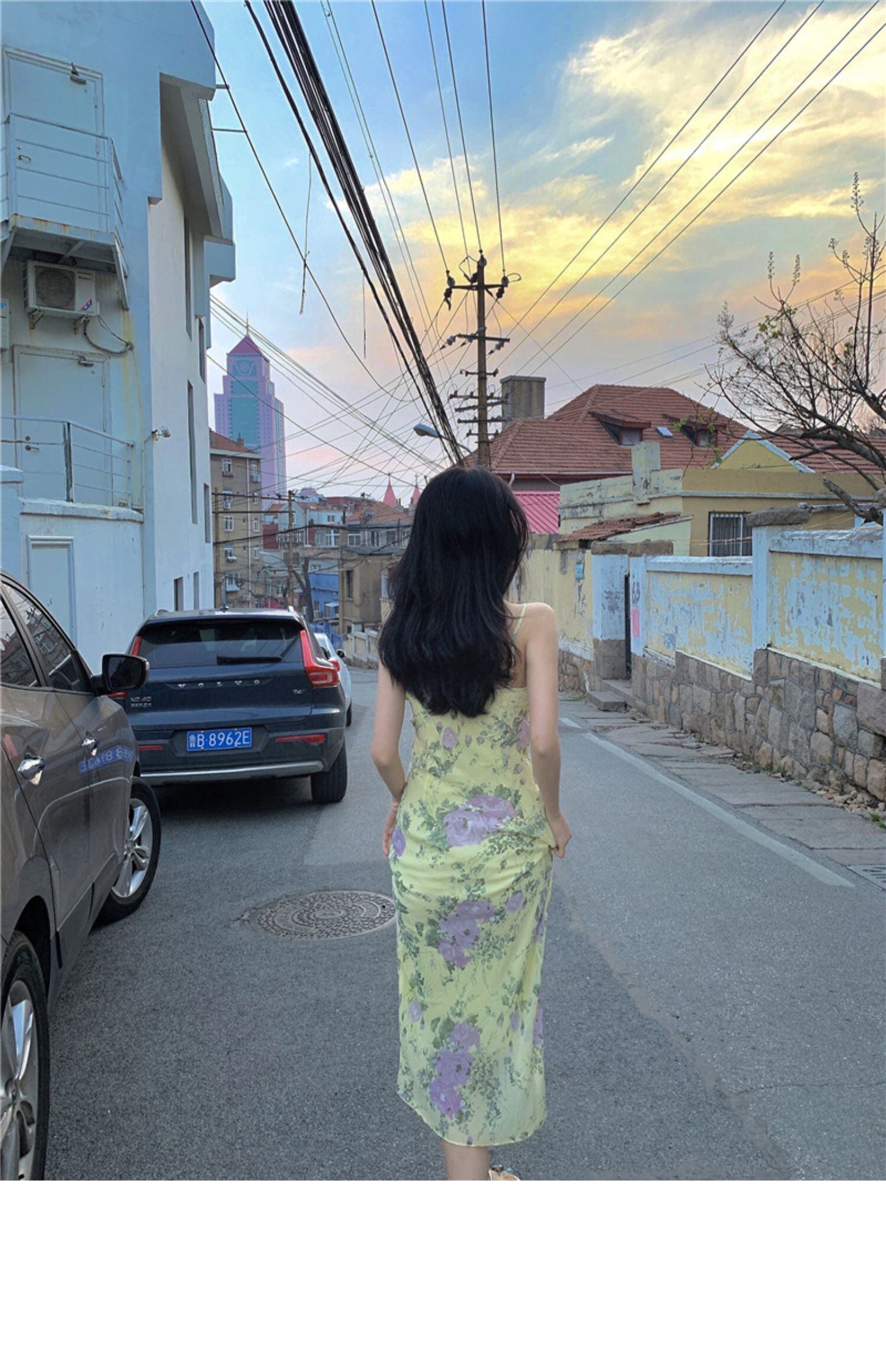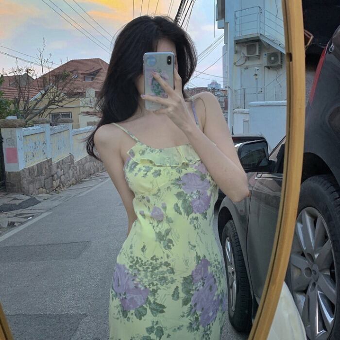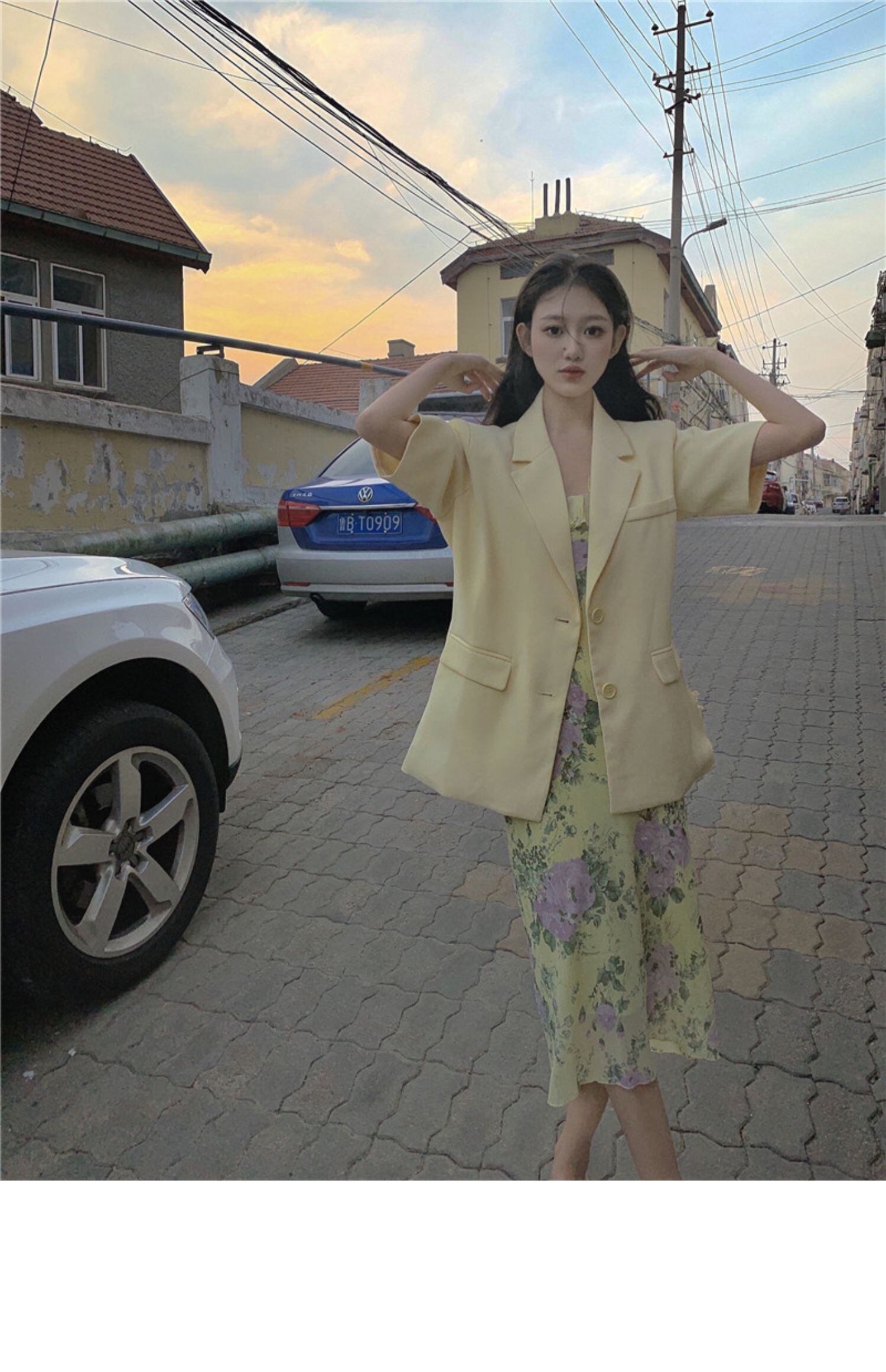 色:花柄ドレス,黄色のスーツ