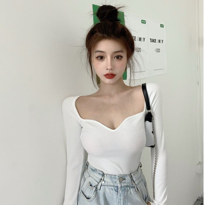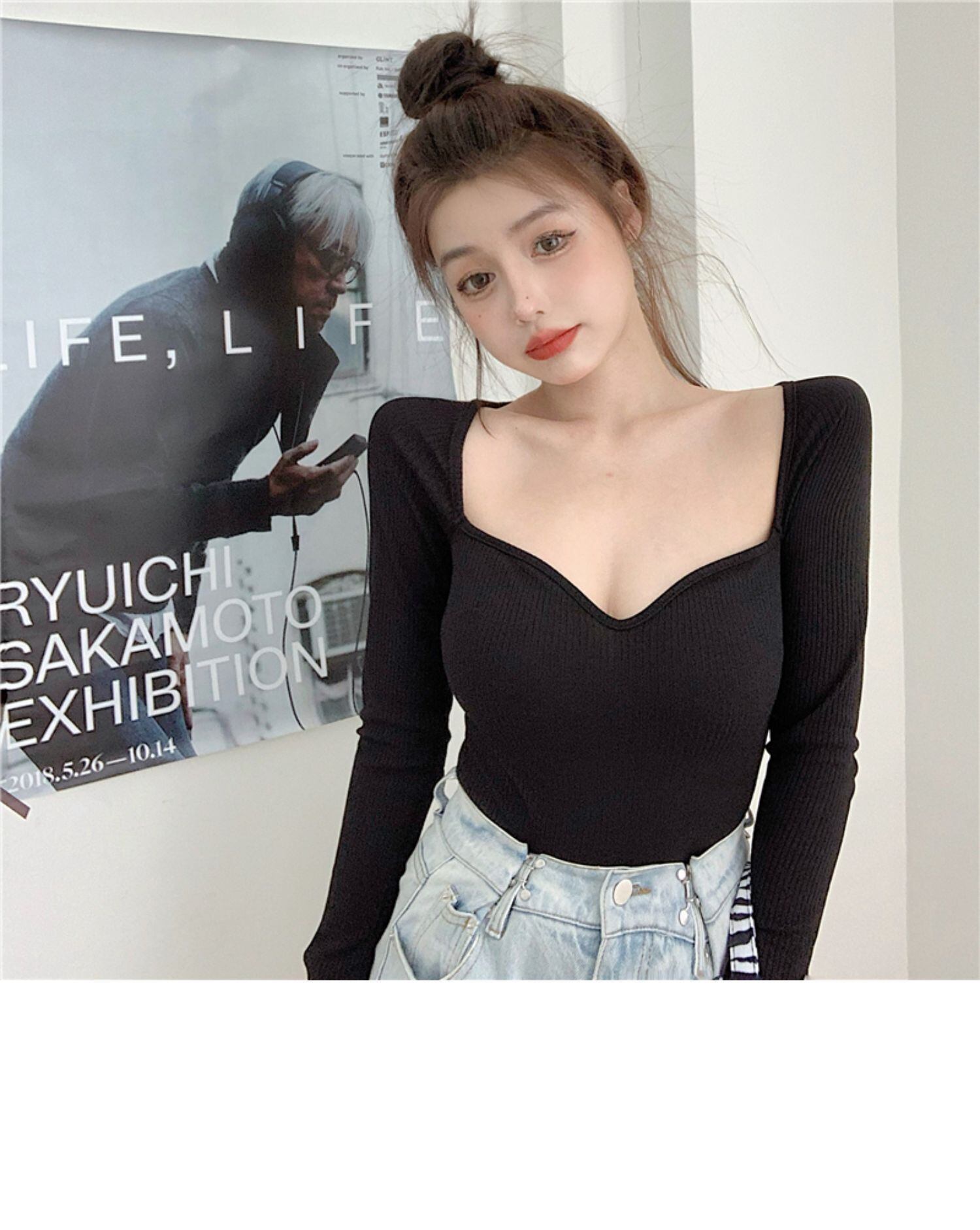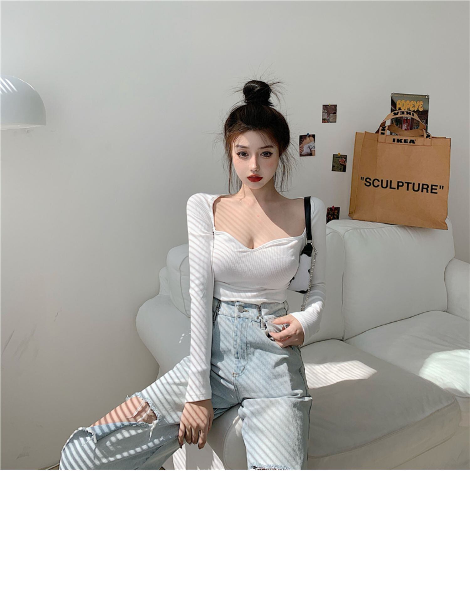 スタンダードカラースリム長袖スリーブTシャツ レディース ロング レトロ ピュア スクウェア ドラファッションホール60482591698
