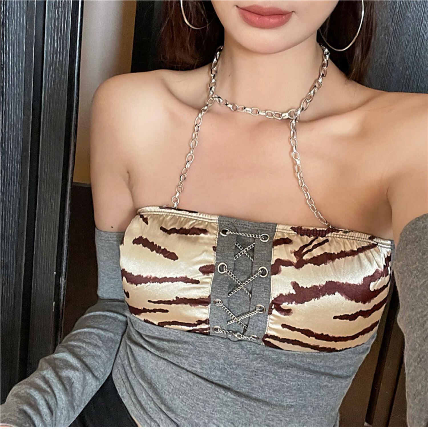 レオパードプリント柄チェーン ホルタースリーブTシャツ トップス サマー 夏物 ステッチ ドラファッションホール70020296595