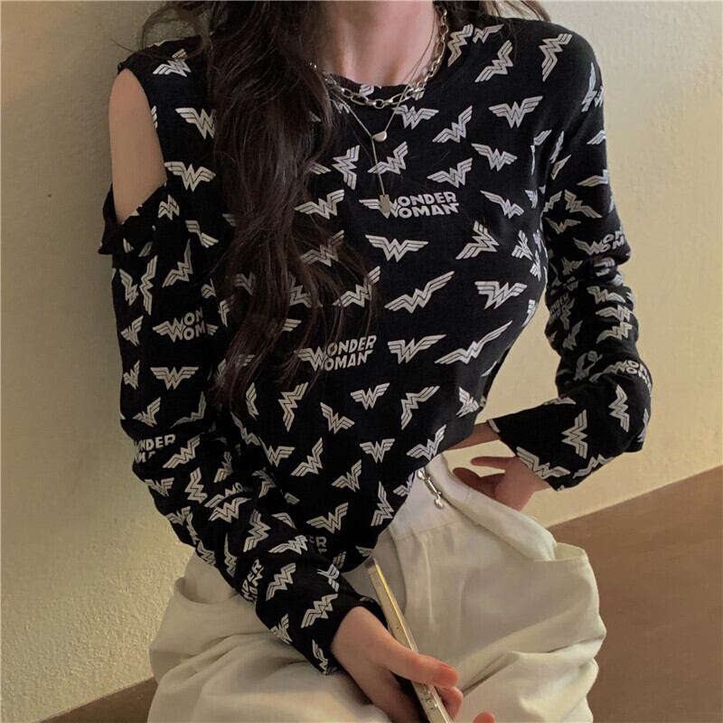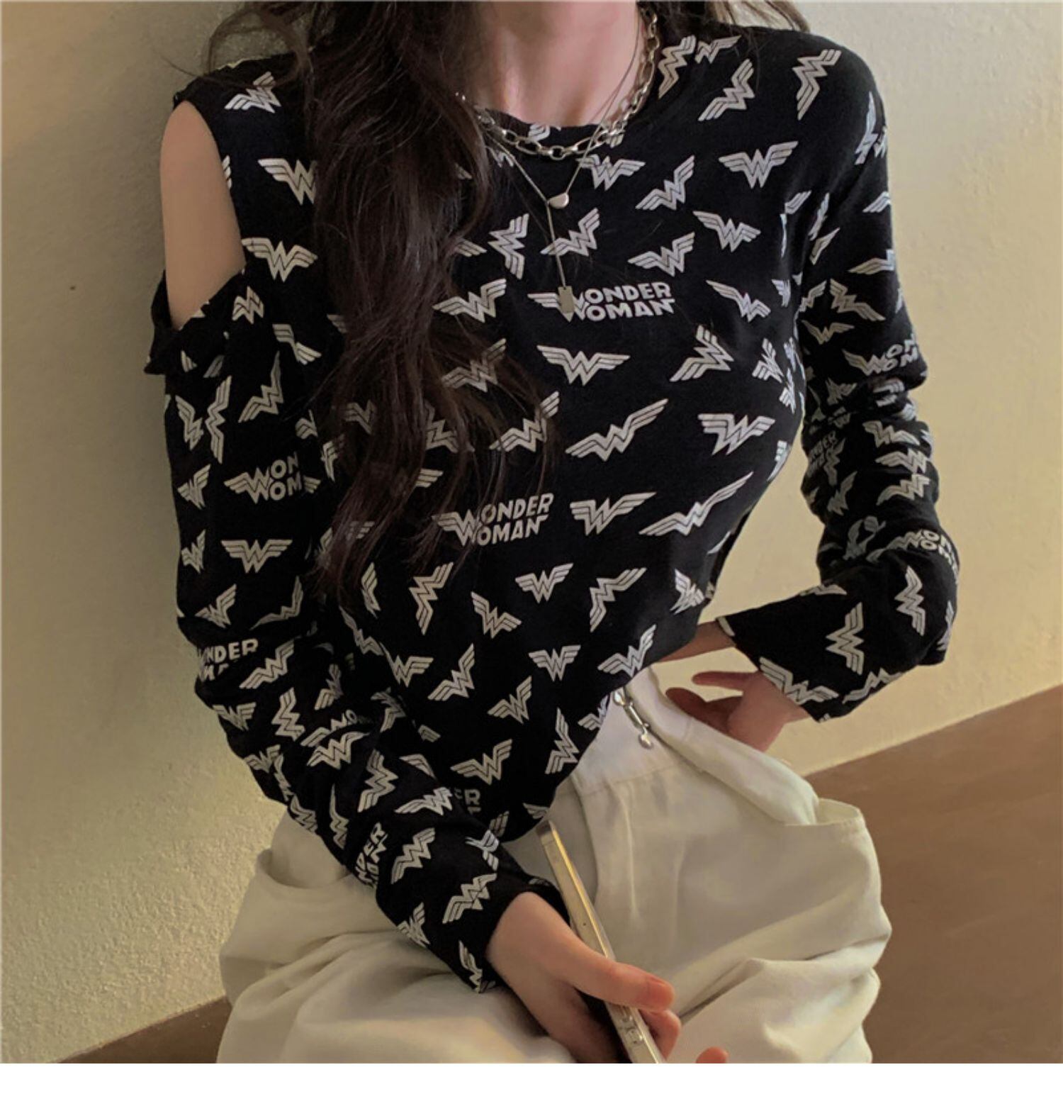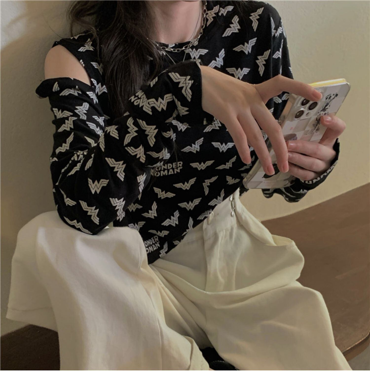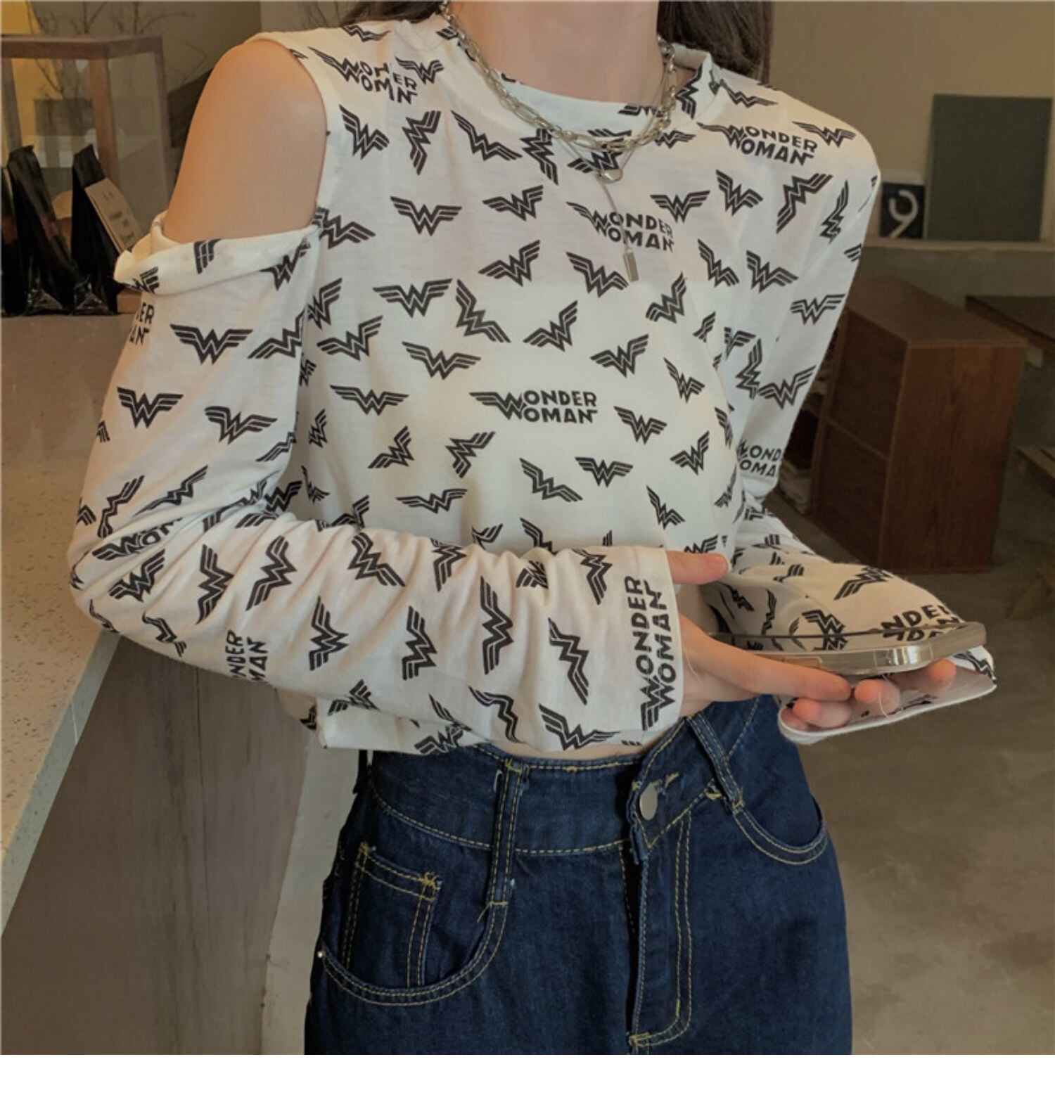 ラウンドネックスリムプリントルーズカジュアルTシャツ オータムレディース ロング 秋物 Oネック オフショルダー ドラファッションホール93971616651