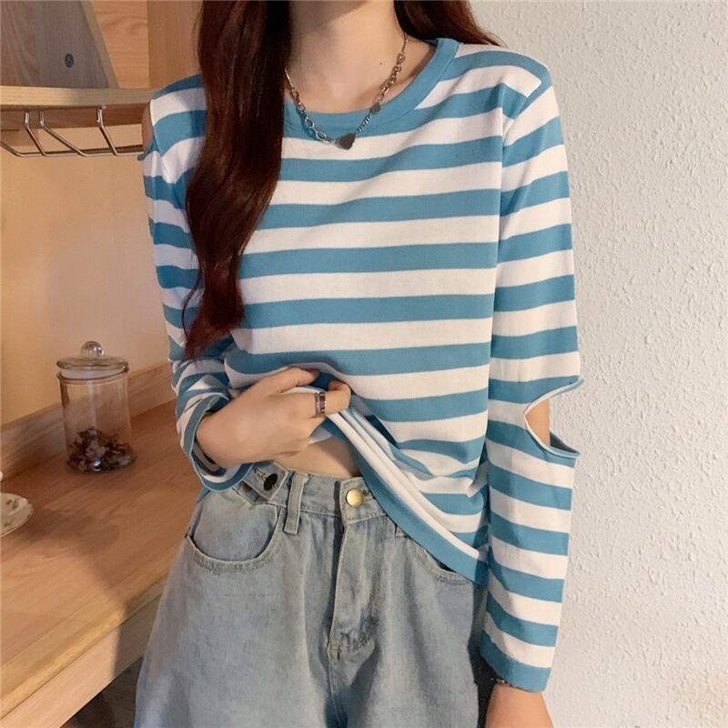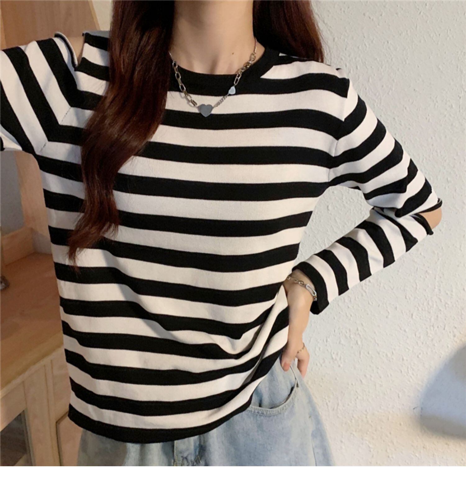 ラウンドネックストライプシャツ ニットTシャツ トップス ロング Oネック ドラファッションホール17271987484