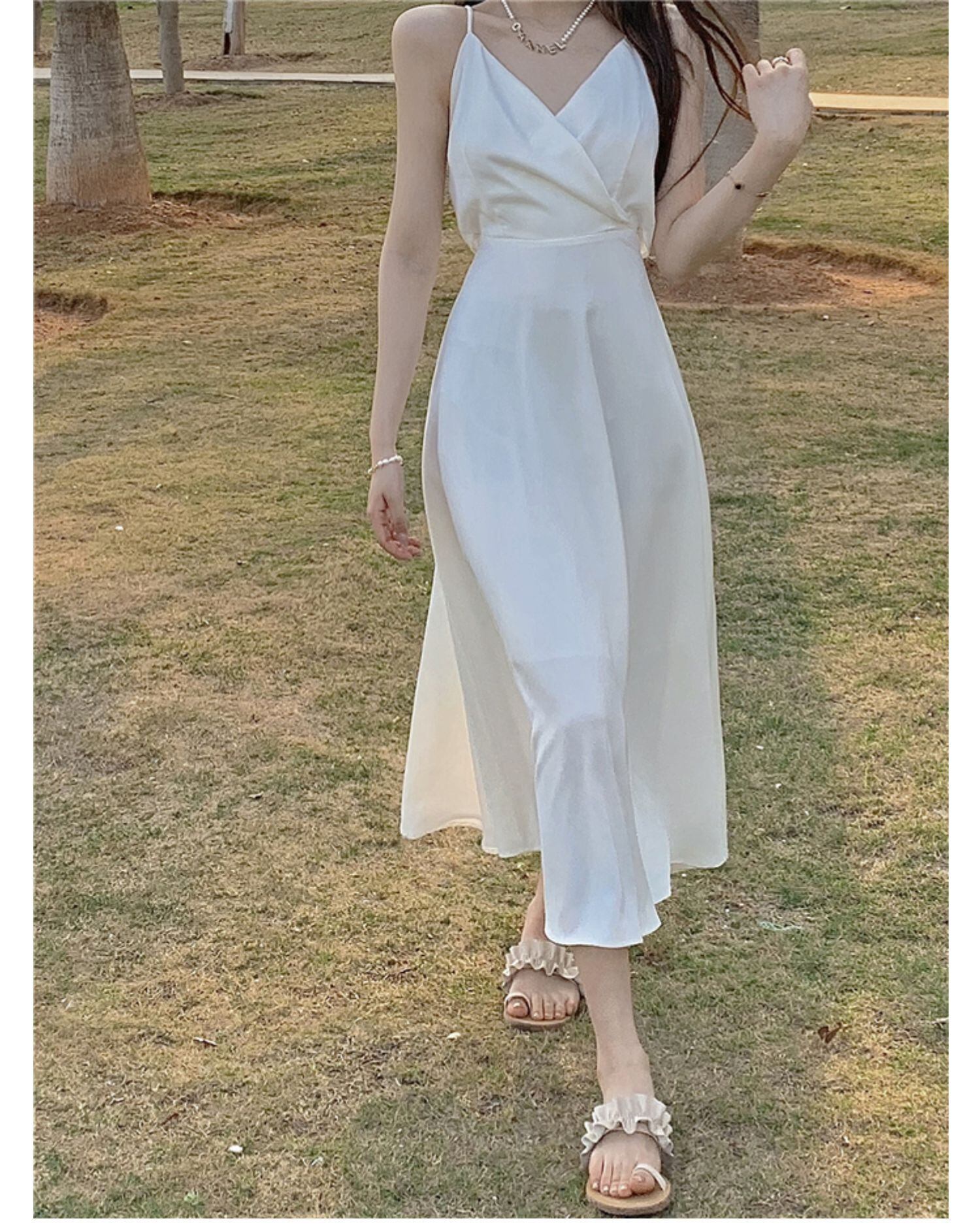 ホルターリボンクロスドレス サマーソリッド カラーVネックAラインスカート 夏物 ソリッドカラー ドラファッションホール40506882873
