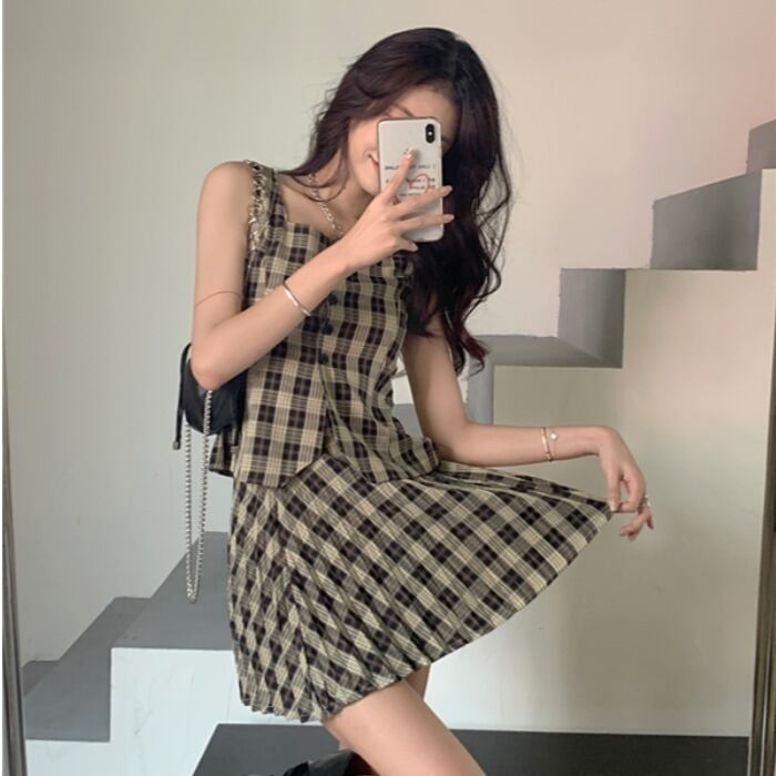 スタンダード格子柄トップス プリーツスカート ショートカジュアルサマー レトロ 夏物 ワイドショルダー ドラファッションホール18009819835