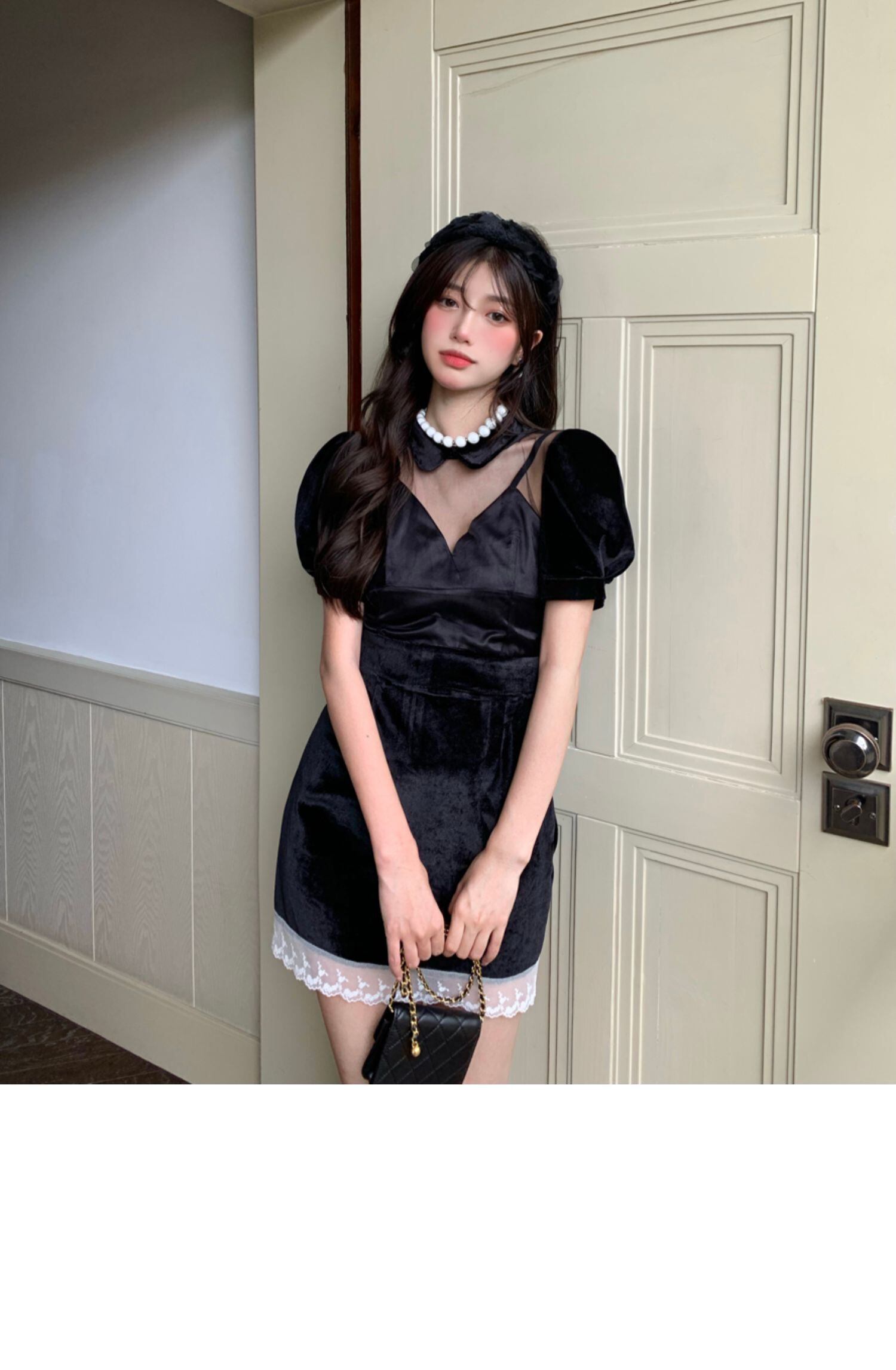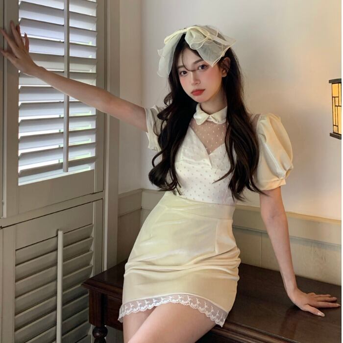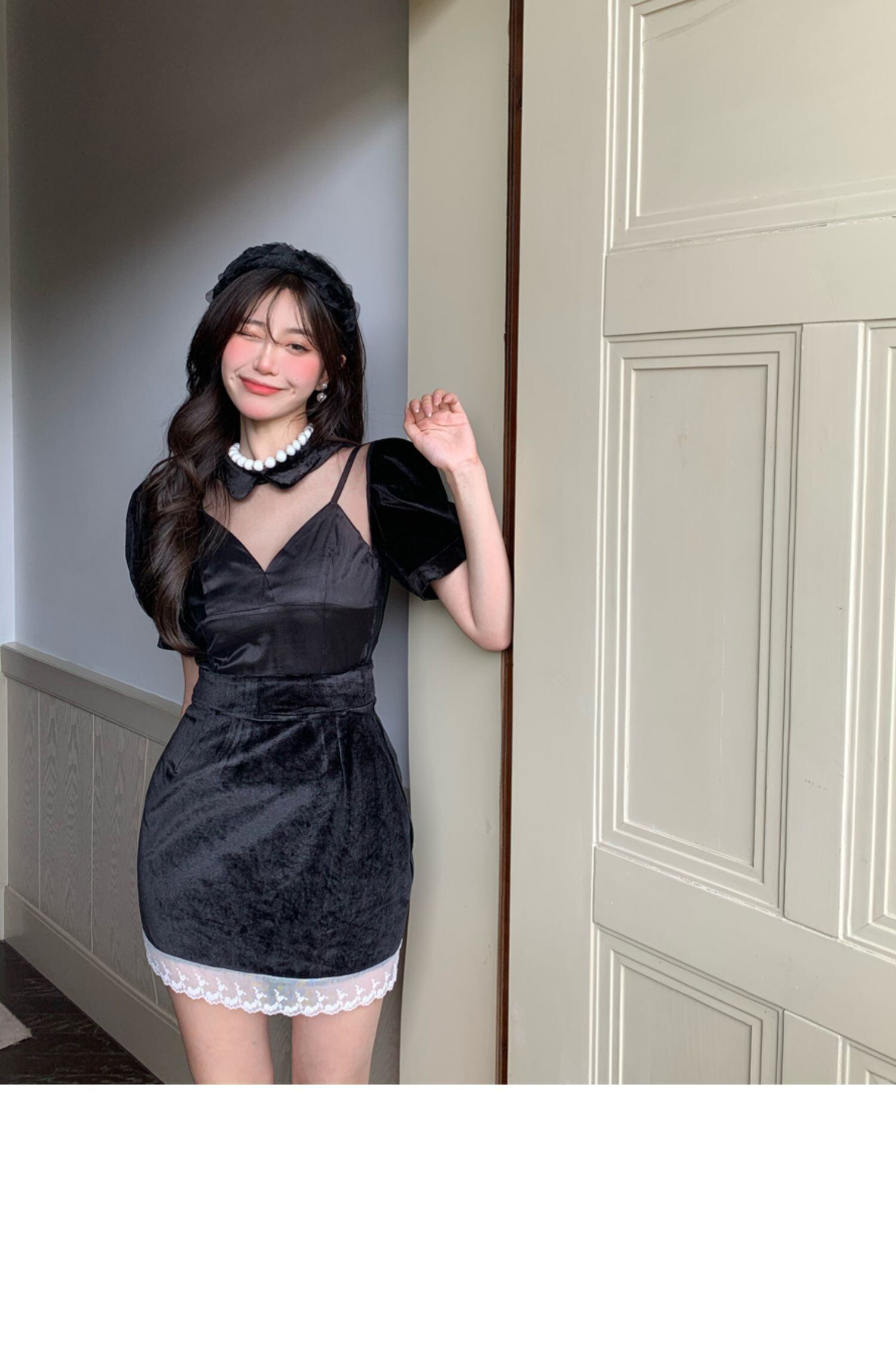 サマースタイルスタンダードメッシュベルベットスカート ウェストドレス レディース レトロ 夏物 ステッチ ドラファッションホール26602623364