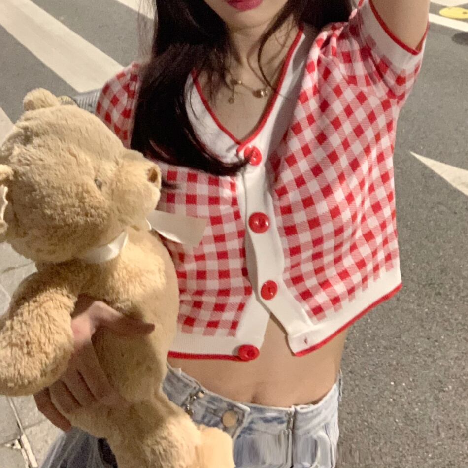 スタンダード格子柄セーター ショートカーディガンジャケット サマー レトロ 大人ガーリー スウィート キュート カジュアル 夏物 ドラファッションホール14056304345