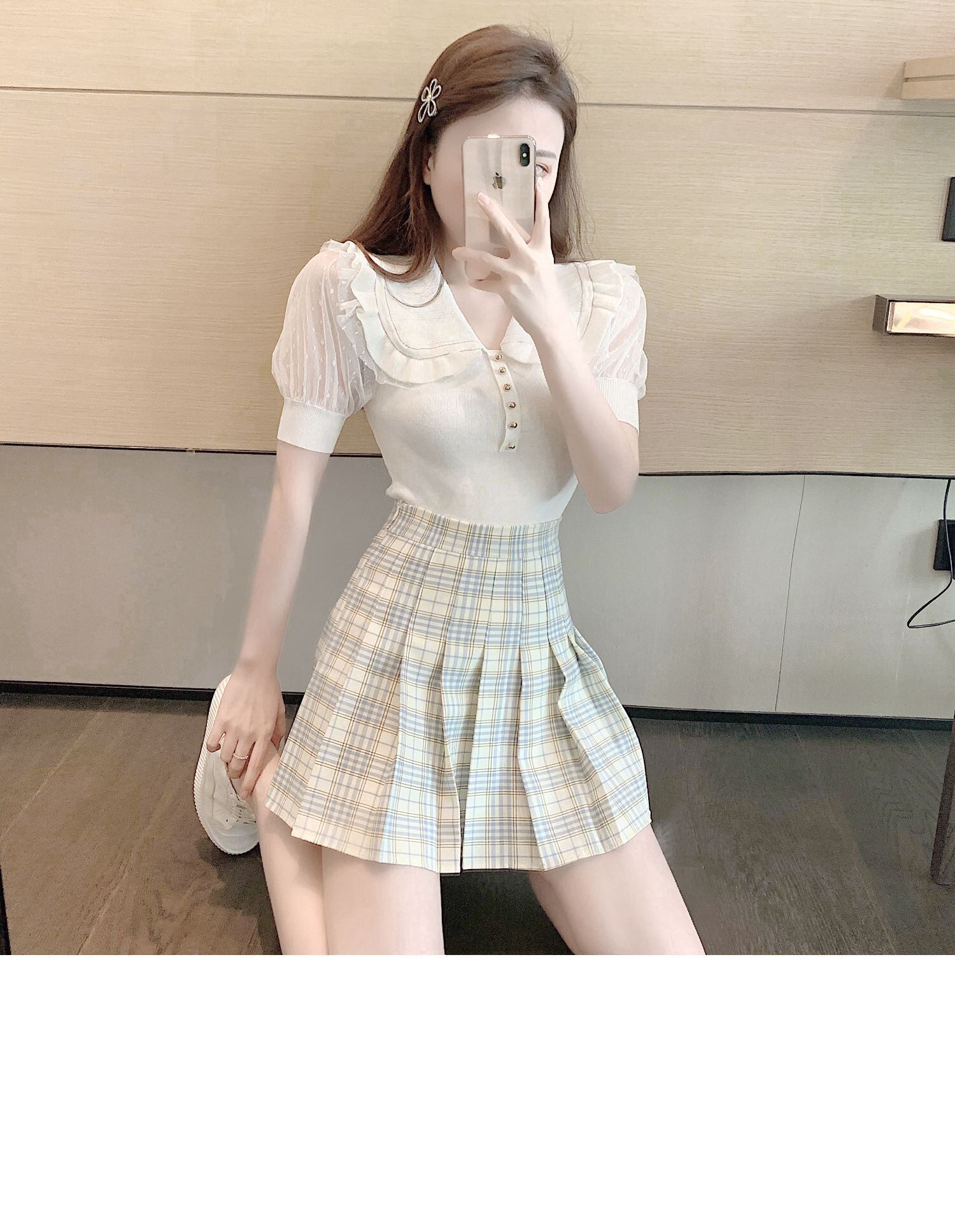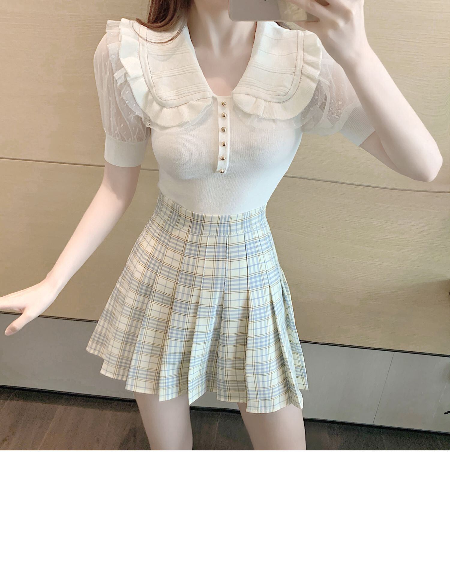 サマースタイルカラーニットセーター 格子柄プリーツスカート 夏物 ドラファッションホール68359367437