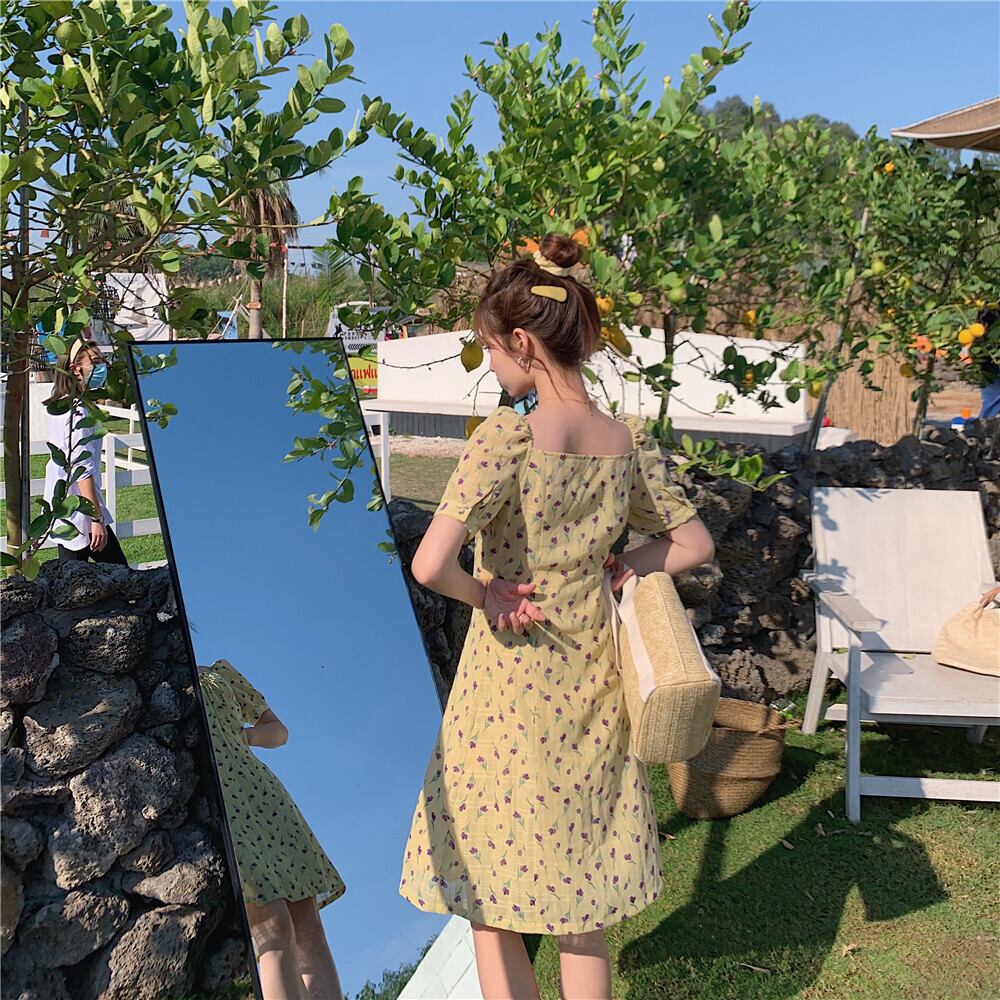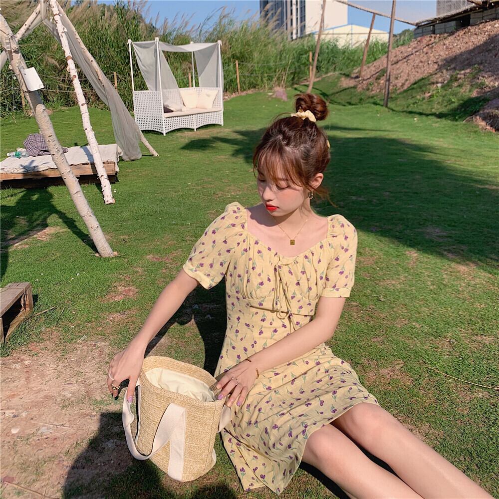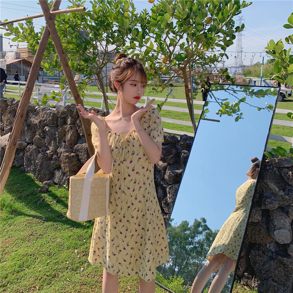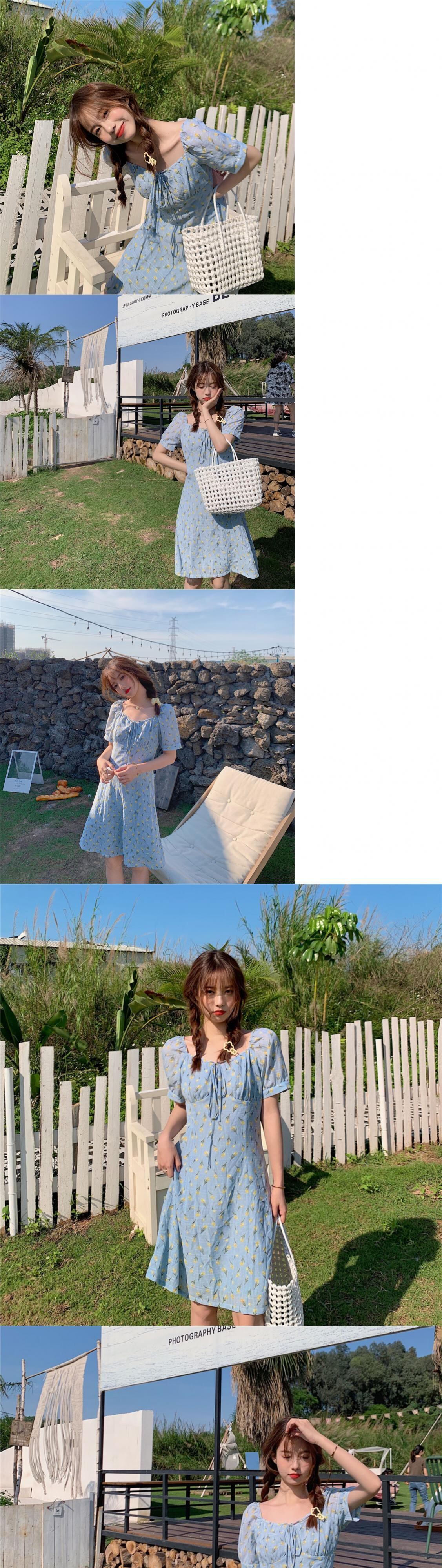 スタンダードカラーフローラルドレス サマーウェストショートスカート レトロ 夏物 花柄 ドラファッションホール22161535640
