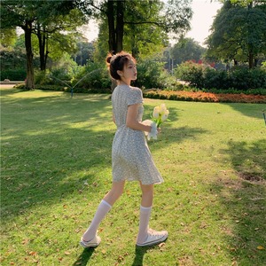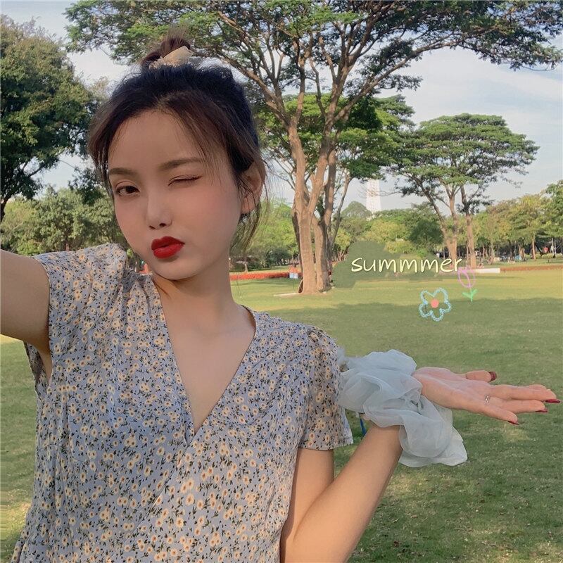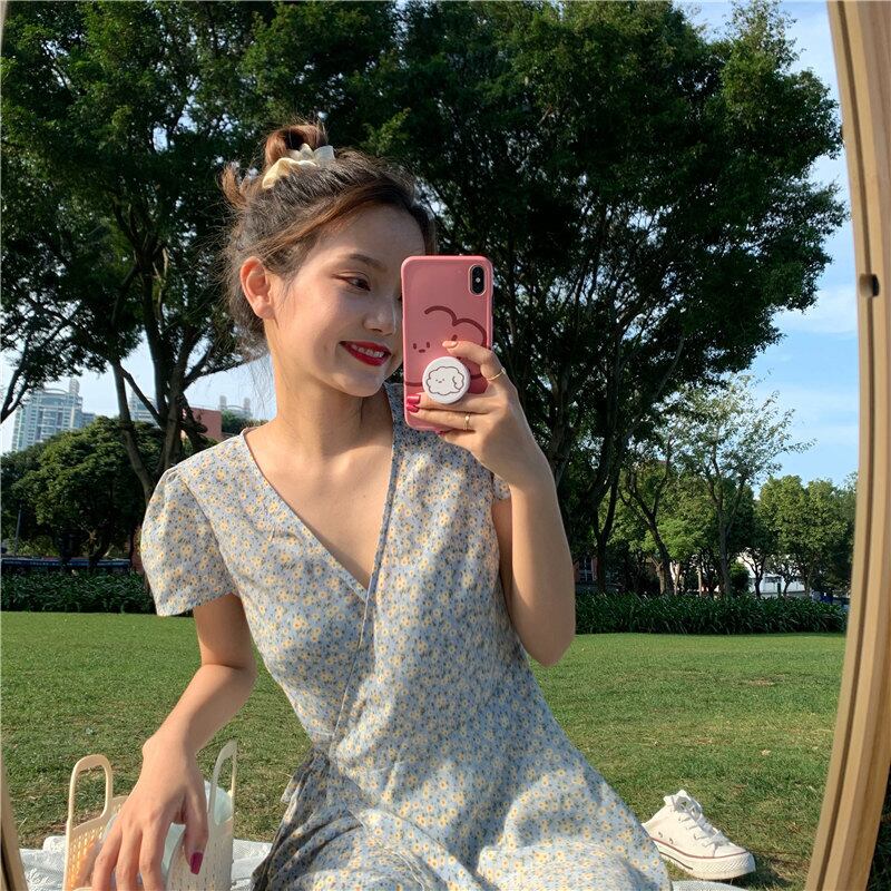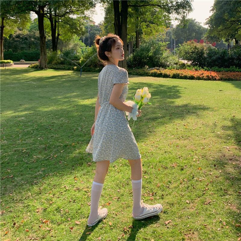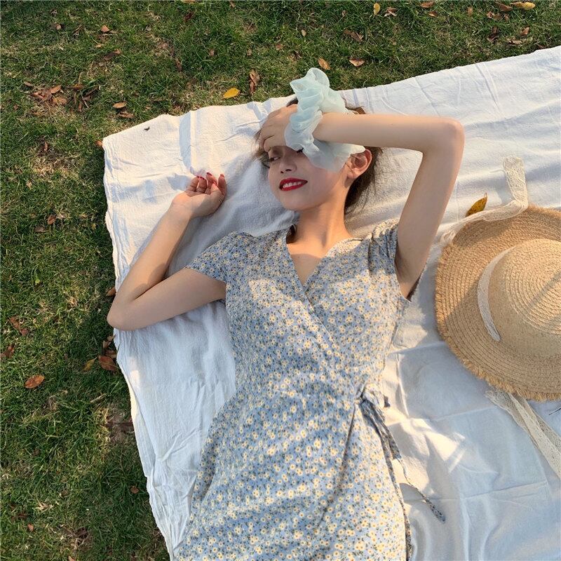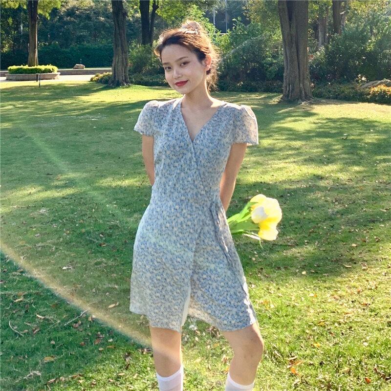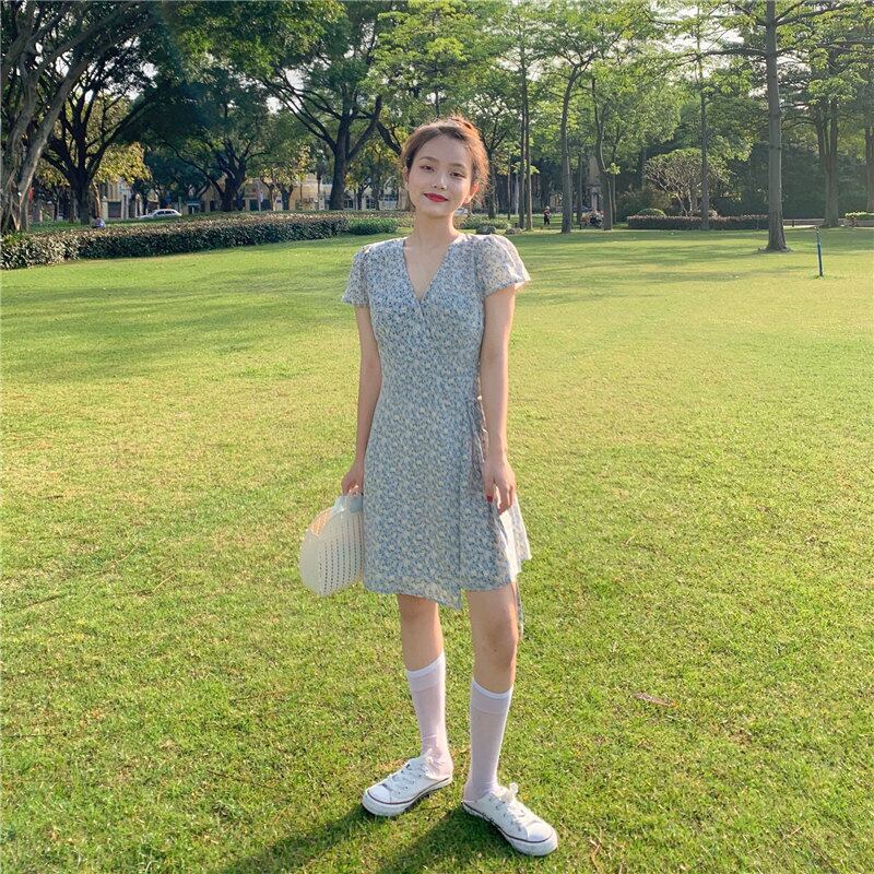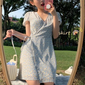 Vネックブルーフローラルウェストドレス サマースタイル薄手ショートスカート 夏物 花柄 ドラファッションホール26658467514