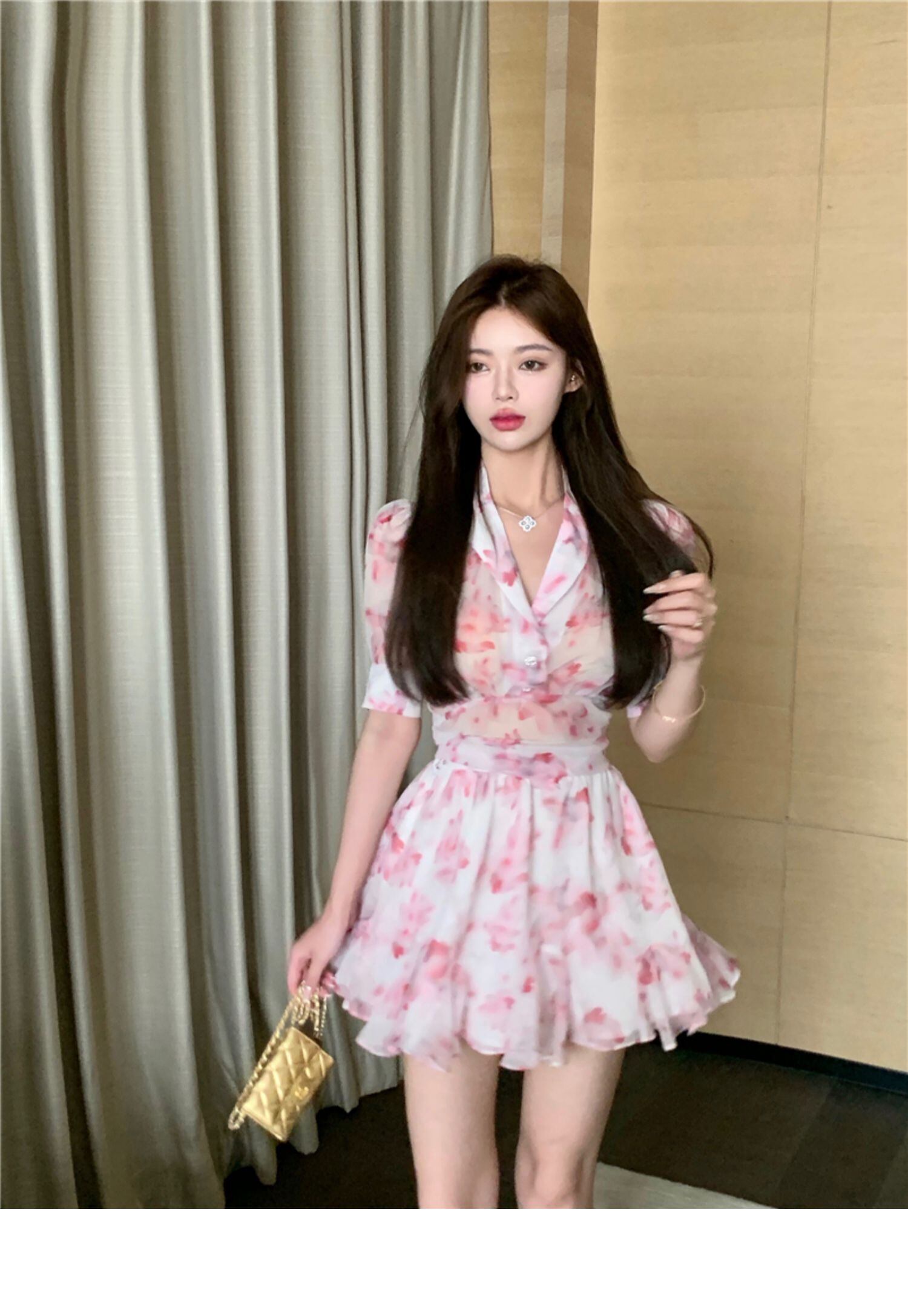 プリント柄ショートシャツ トップス ハイウェストウェストスリムスカート ドレス レディース ピンク 大人ガーリー スウィート キュート カジュアル ドラファッションホール49242125301
