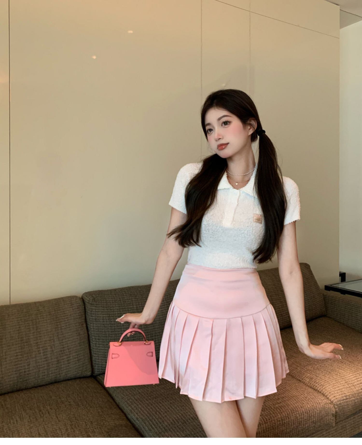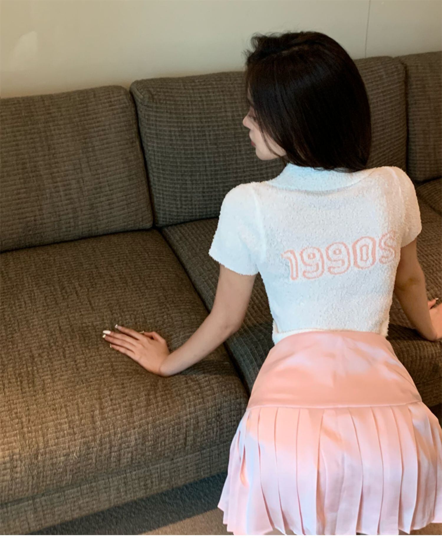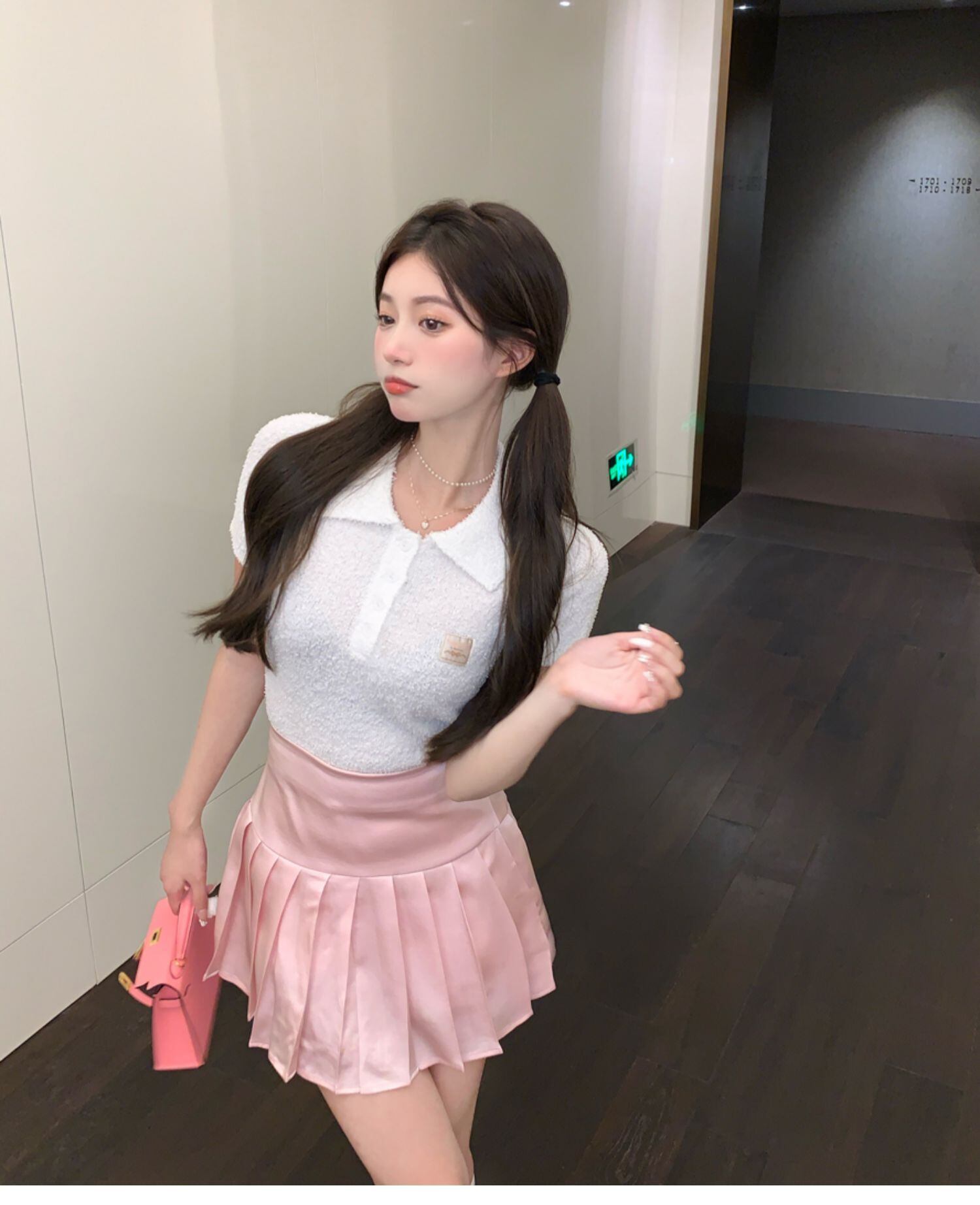 スタンダードニットサテンプリーツスカート ショートTシャツ トップス サマー レトロ 夏物 ドラファッションホール91765344948