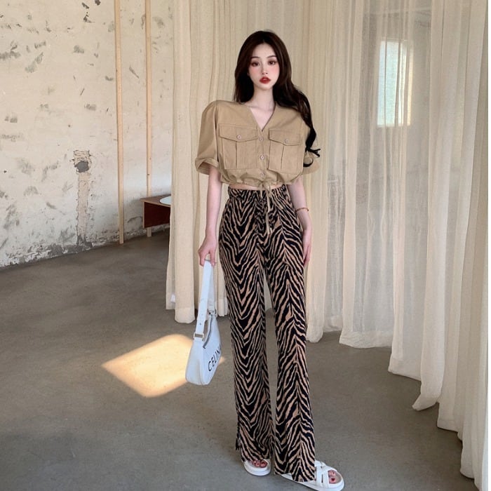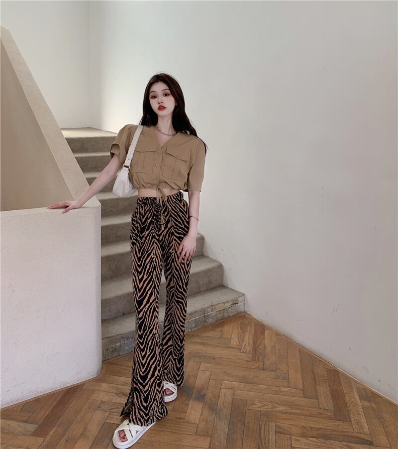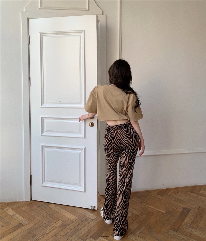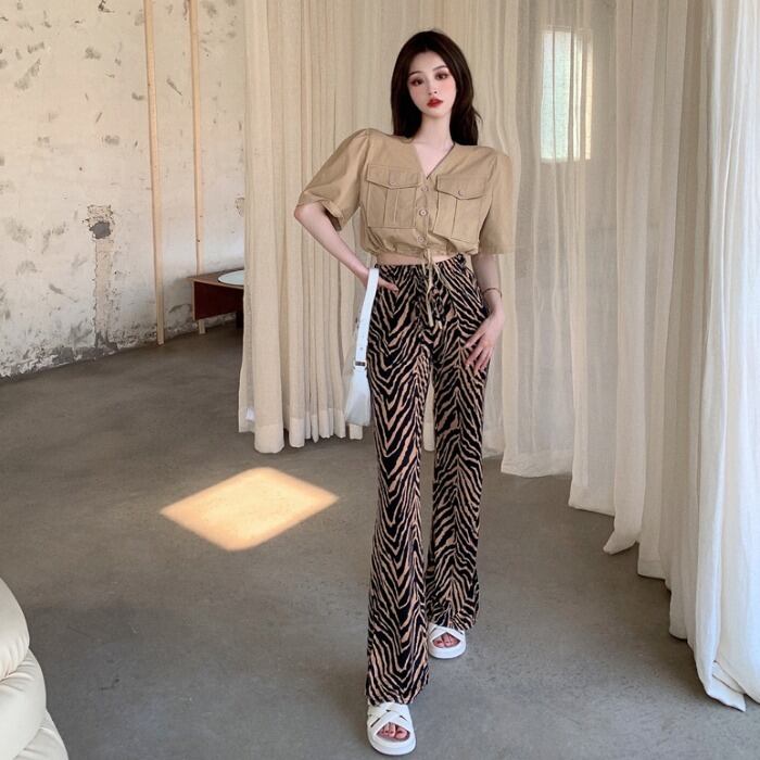 ギャザートップス パターンストレッチウェストスリットワイドレッグパンツ セット サマー エラスティック 伸縮 夏物 ワイドパンツ ドラファッションホール15018356373