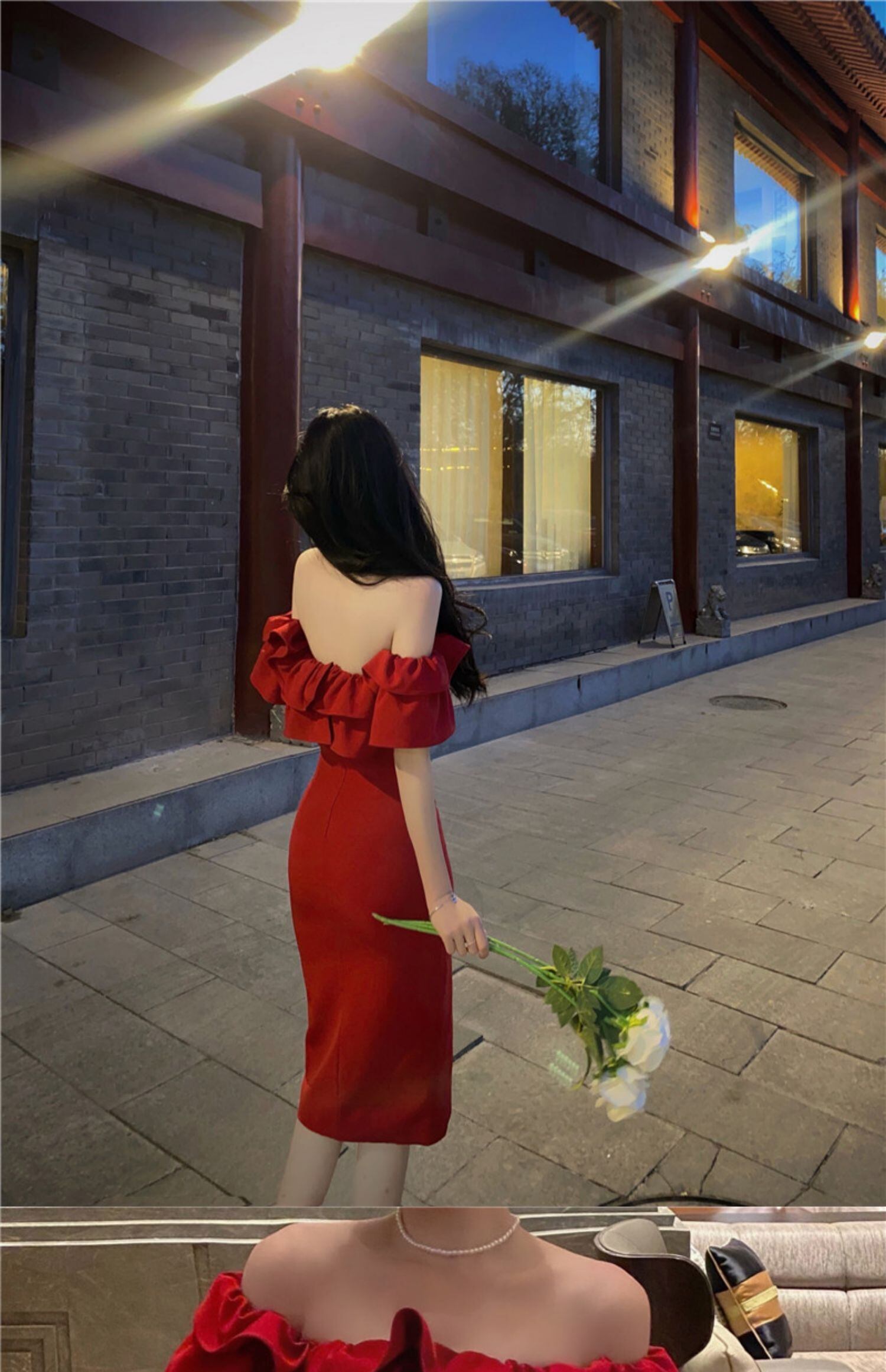 サマースタイルスタンダードウェストレッドロングスカート カラードレス レディース レトロ 夏物 オフショルダー ドラファッションホール14628717509