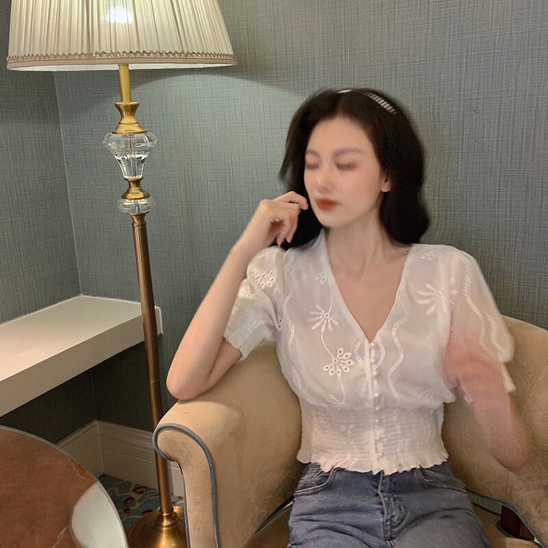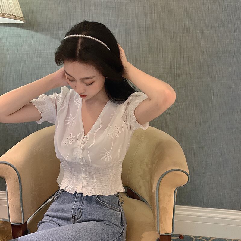 サマーVネック刺繍ウェストショートスリムスリーブシャツ レディース 夏物 ドラファッションホール84456492637