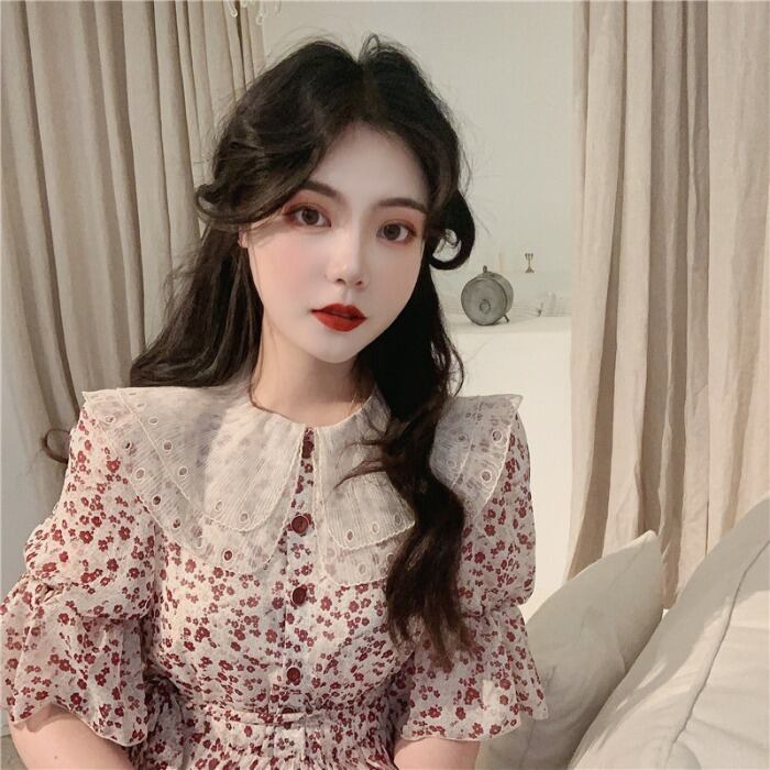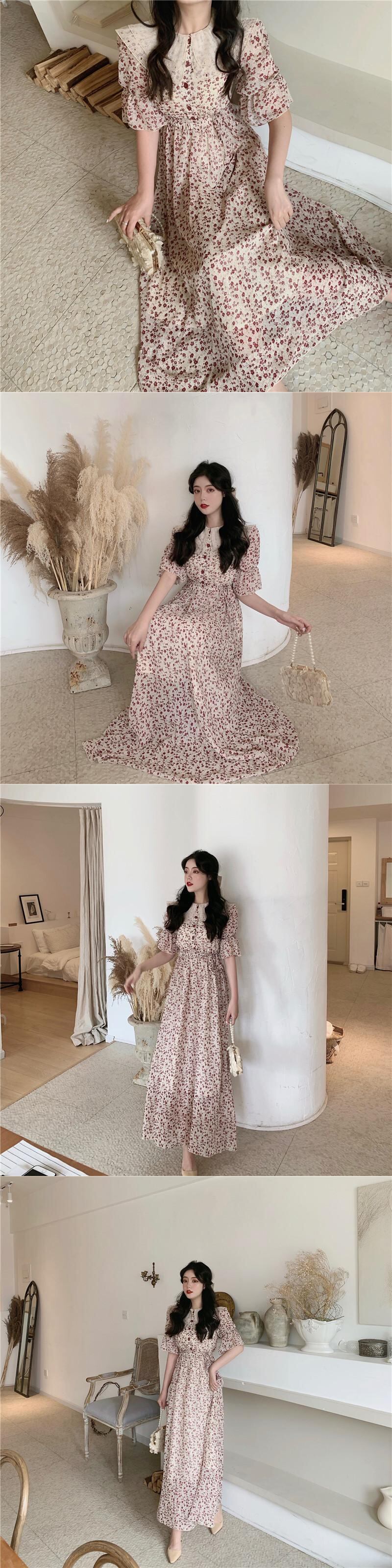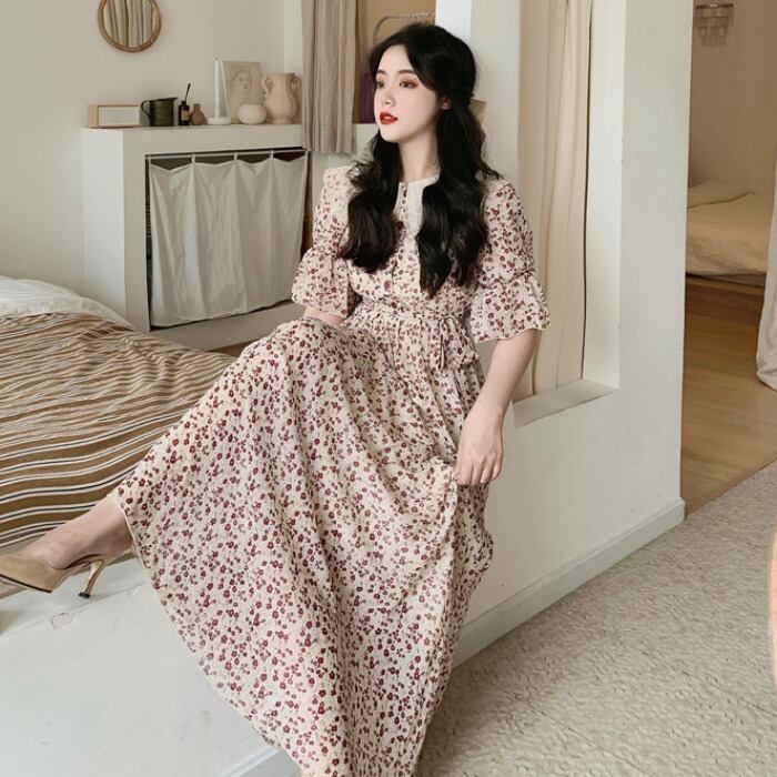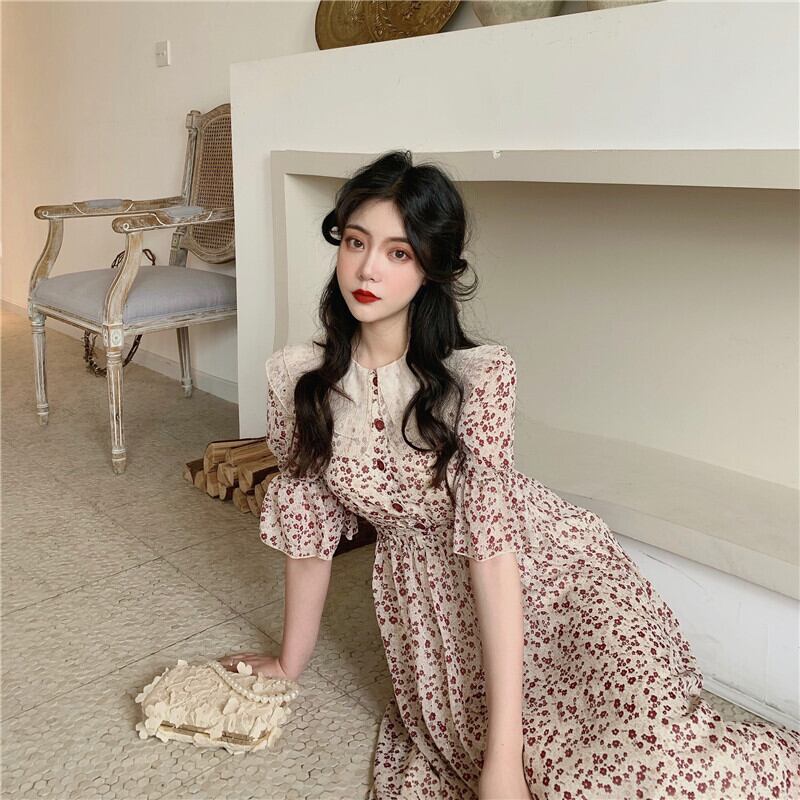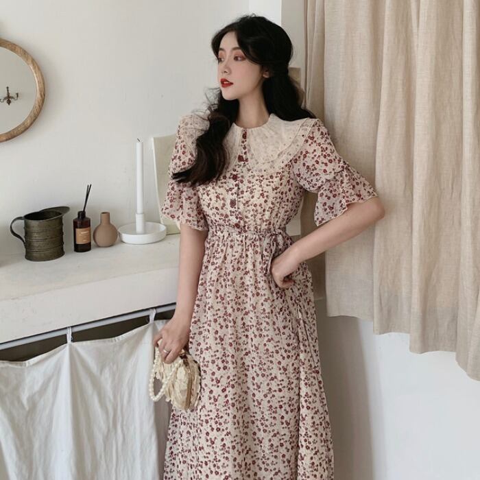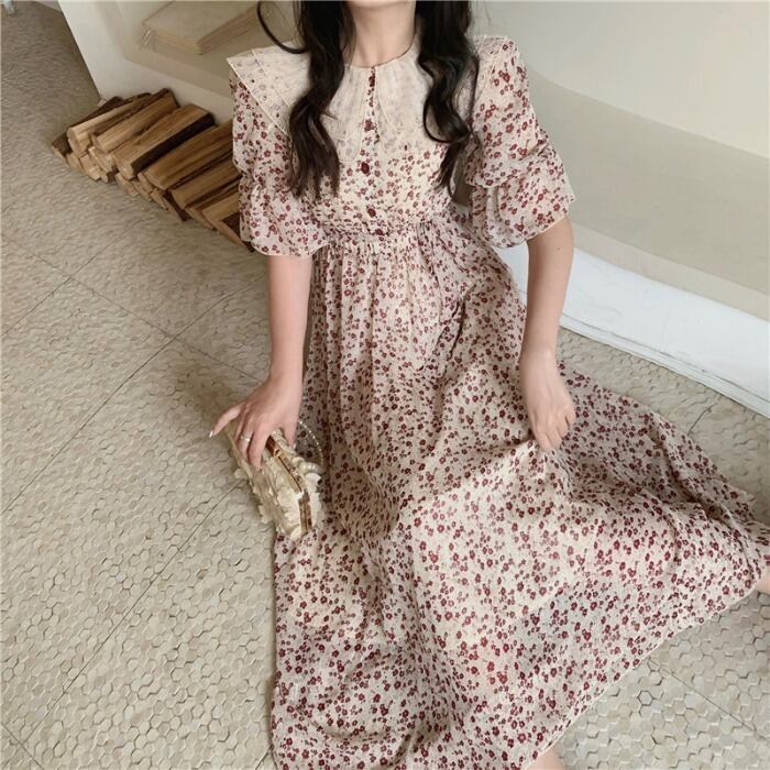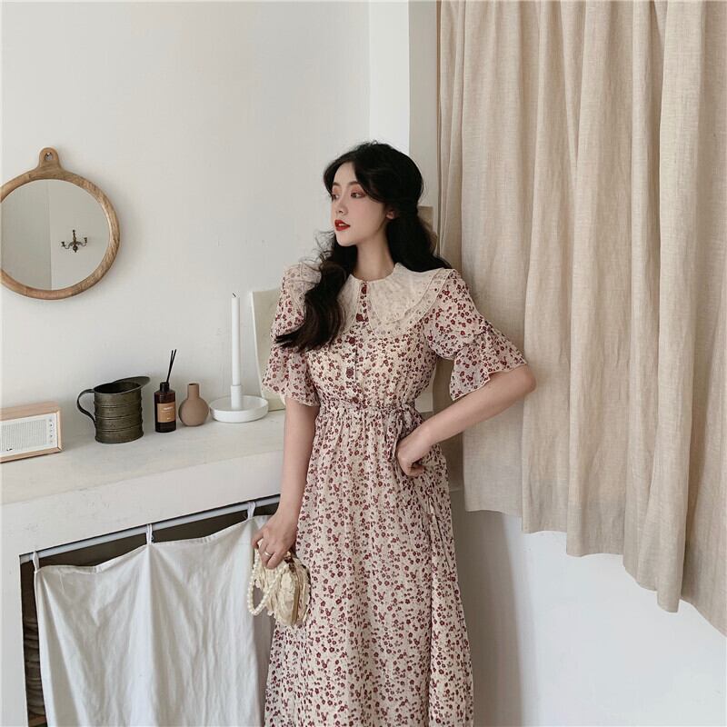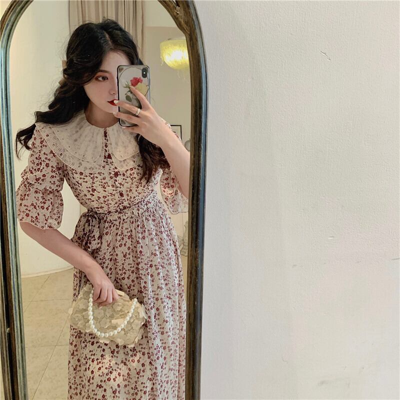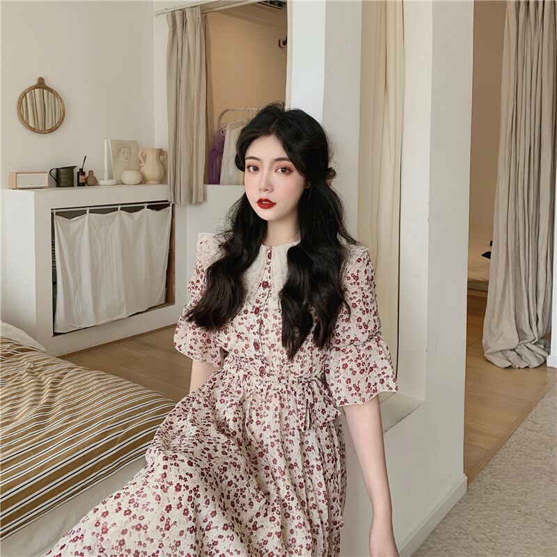サマースタイルスタンダードレースカラーフローラルスカート ウェストドレス レディース レトロ 夏物 花柄 ドラファッションホール96566162367