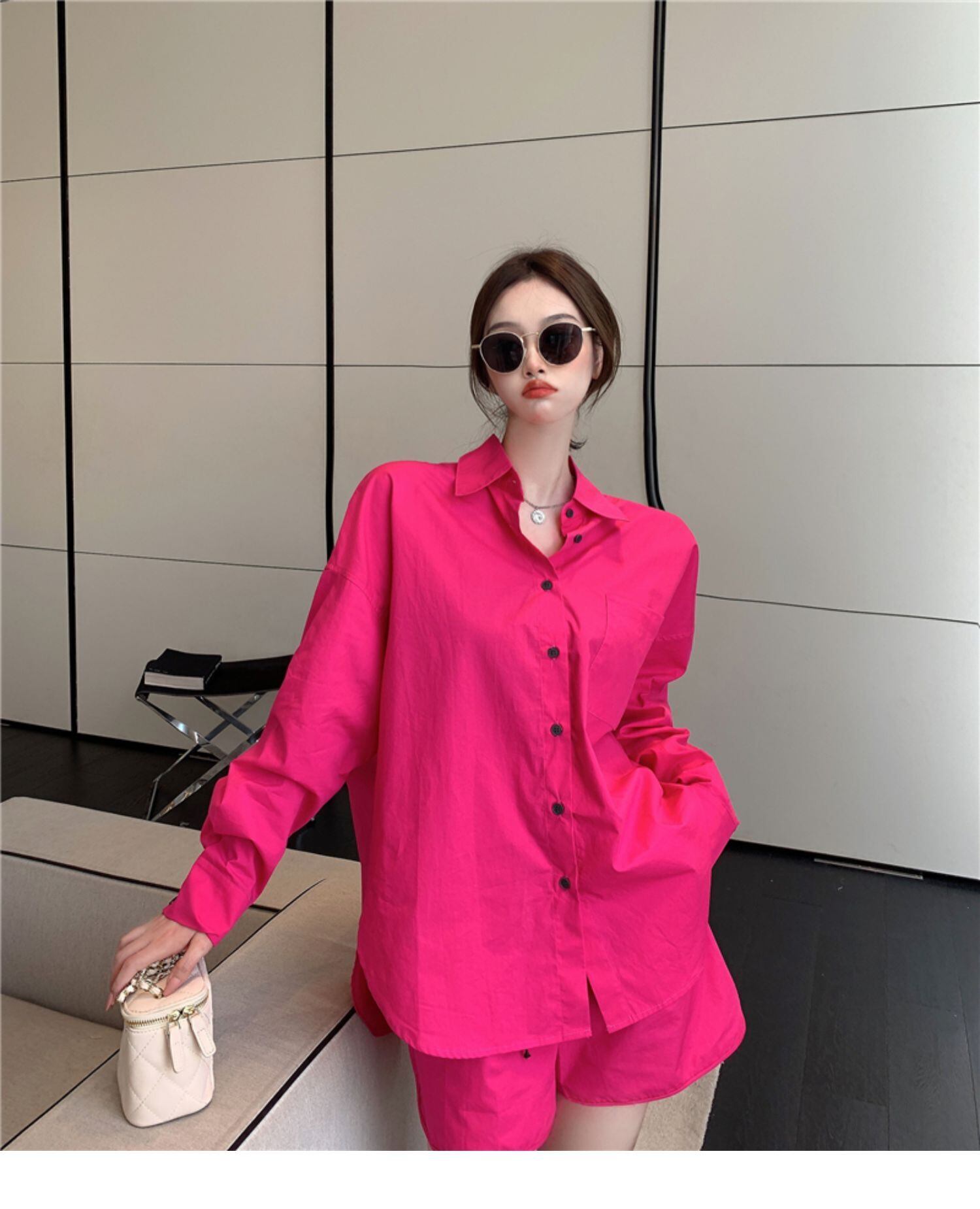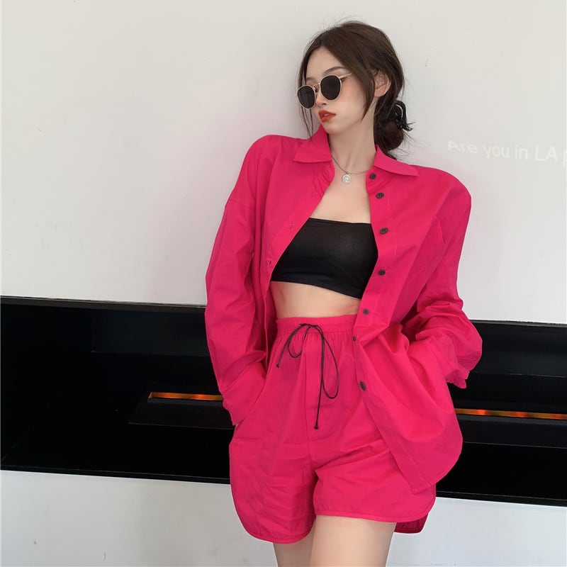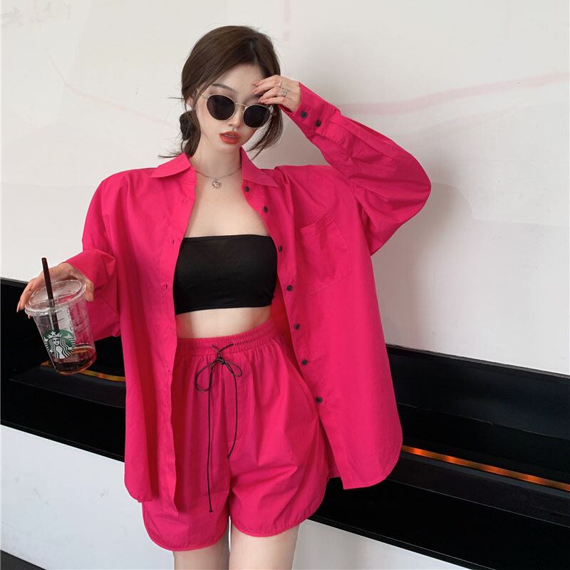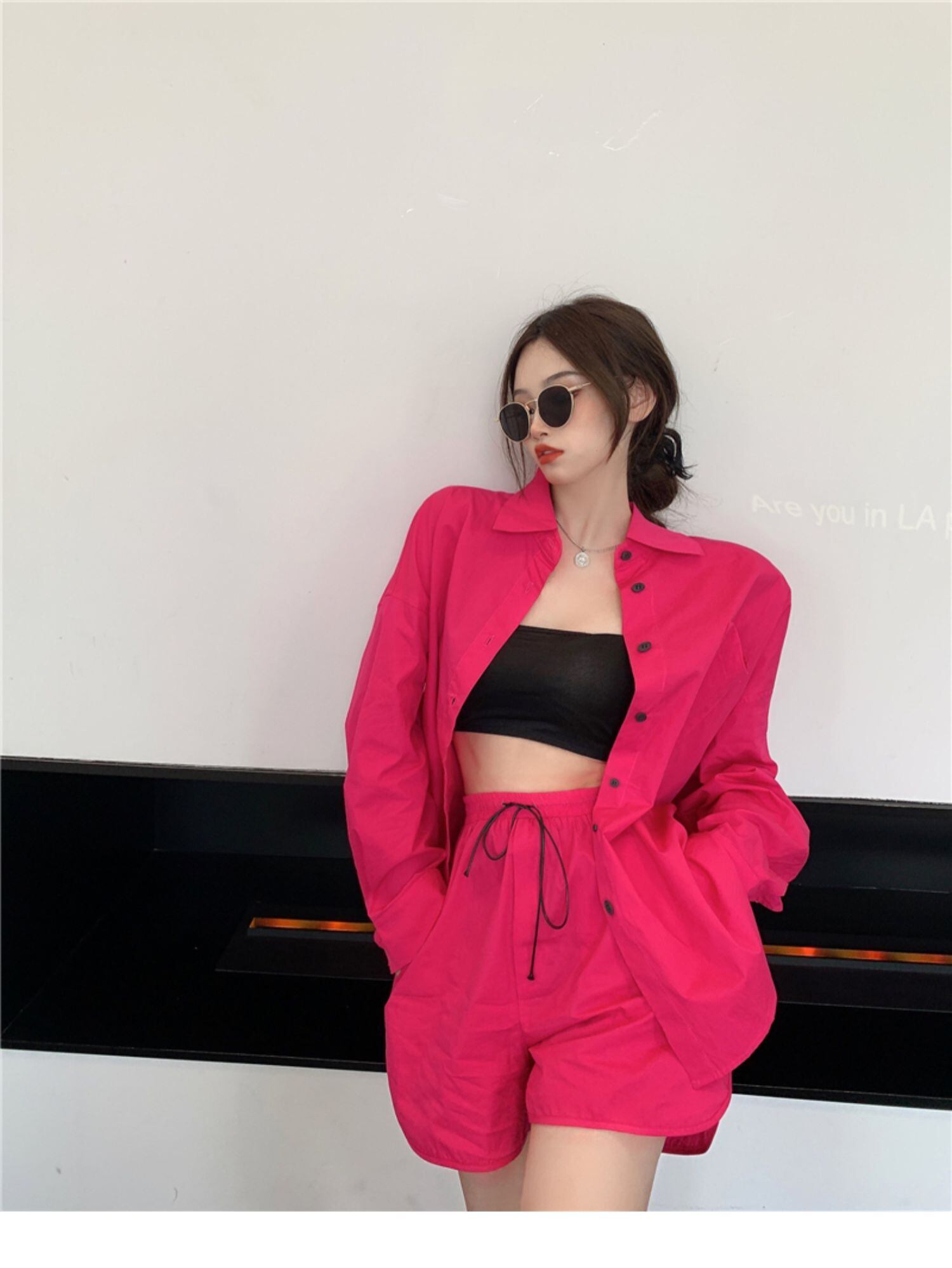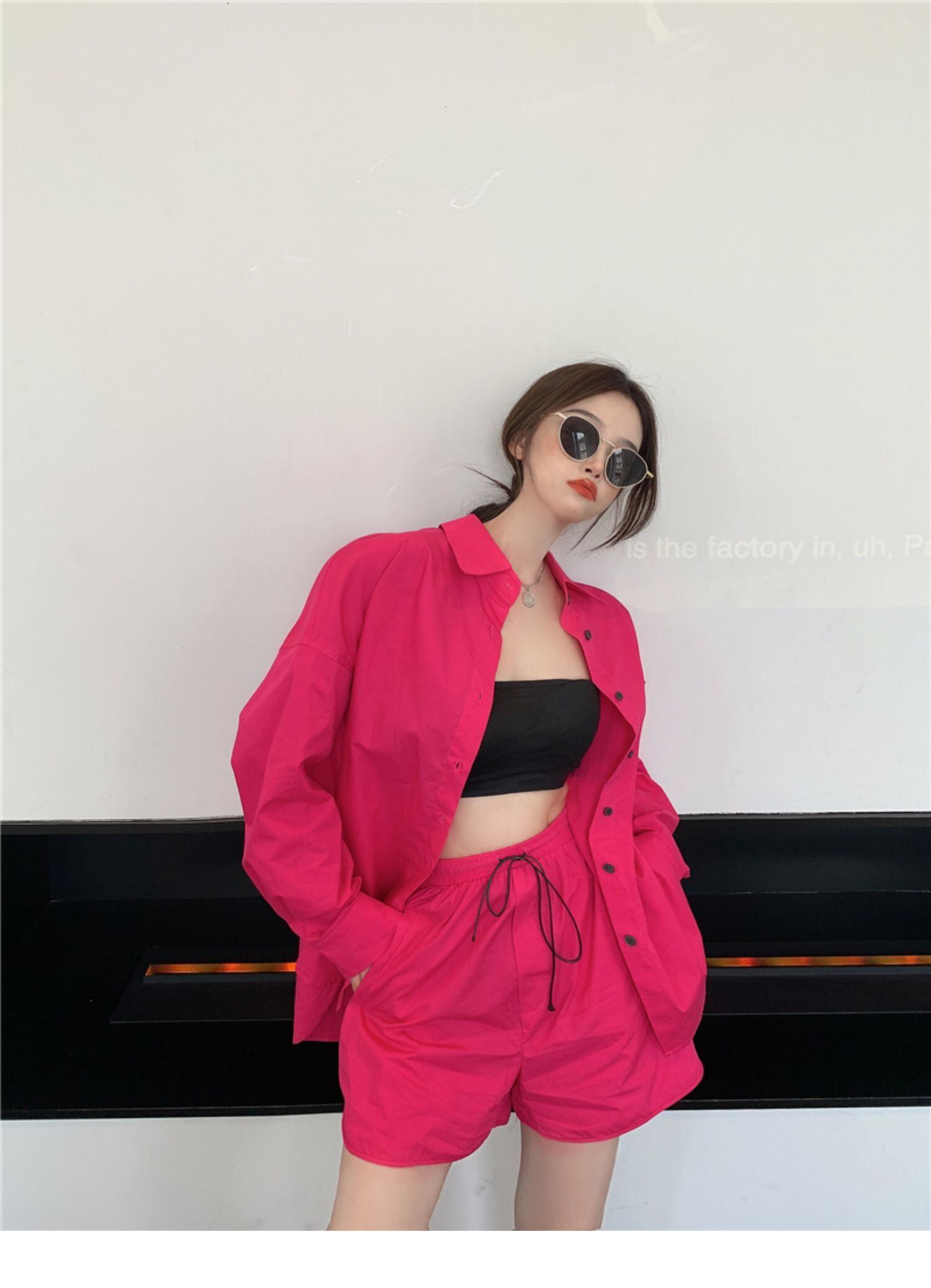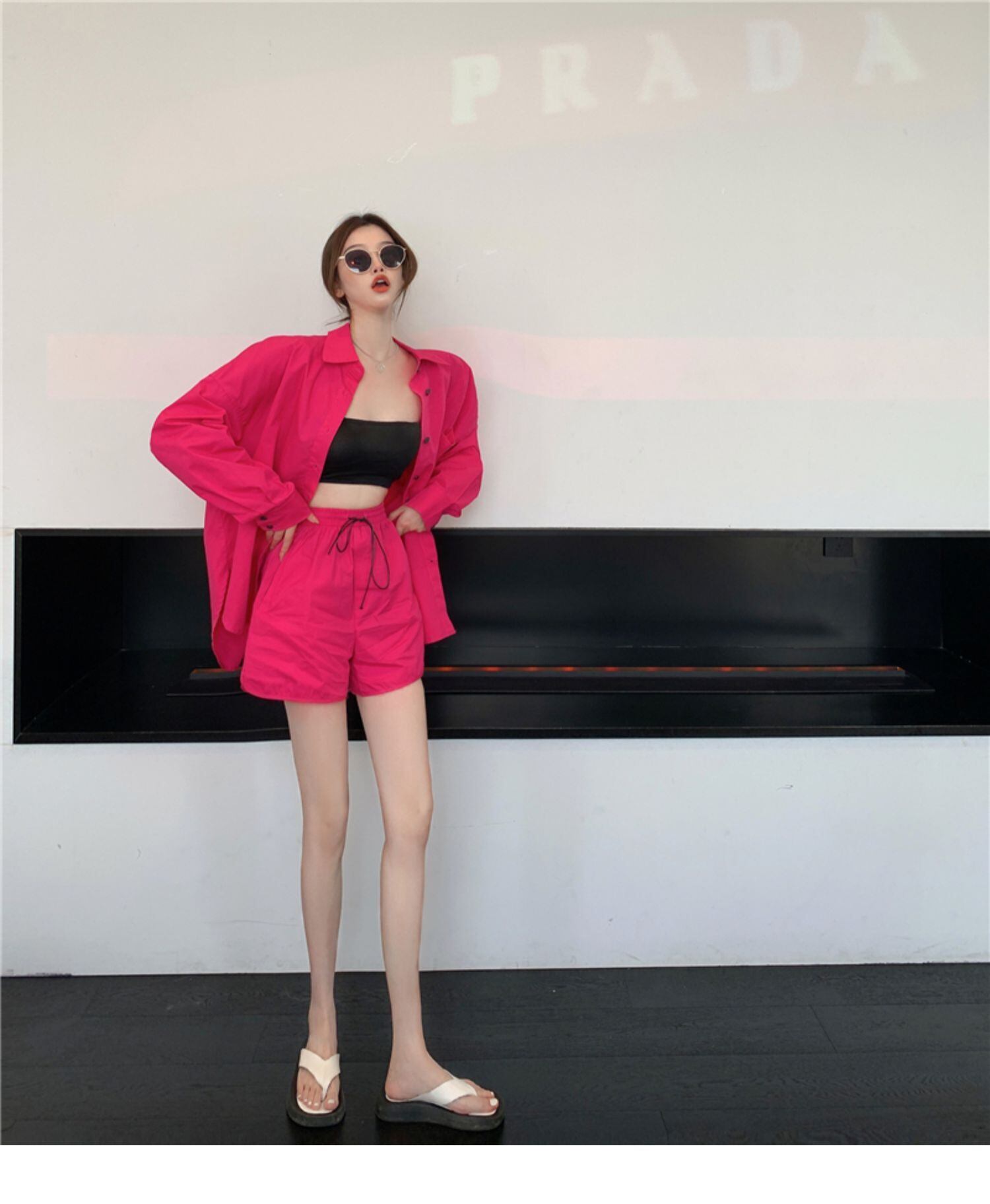 サマースタイルソリッド カラールーズシャツ ハイウェストカジュアルショーツ ロング ストリート 夏物 ブルマー ソリッドカラー ドラファッションホール79195680420