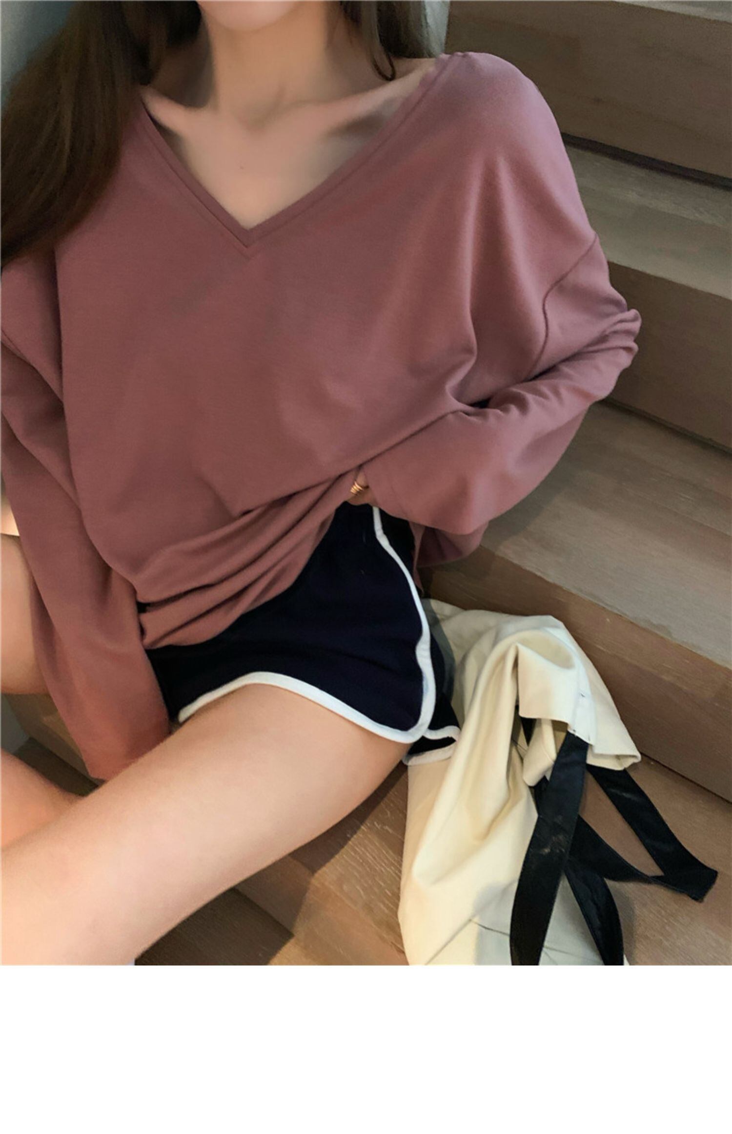サマーVネックルーズレッドシャツ ソリッド カラーTシャツ レディース 夏物 ソリッドカラー ドラファッションホール44383421490
