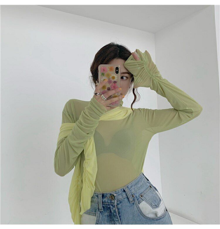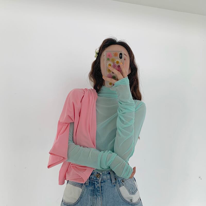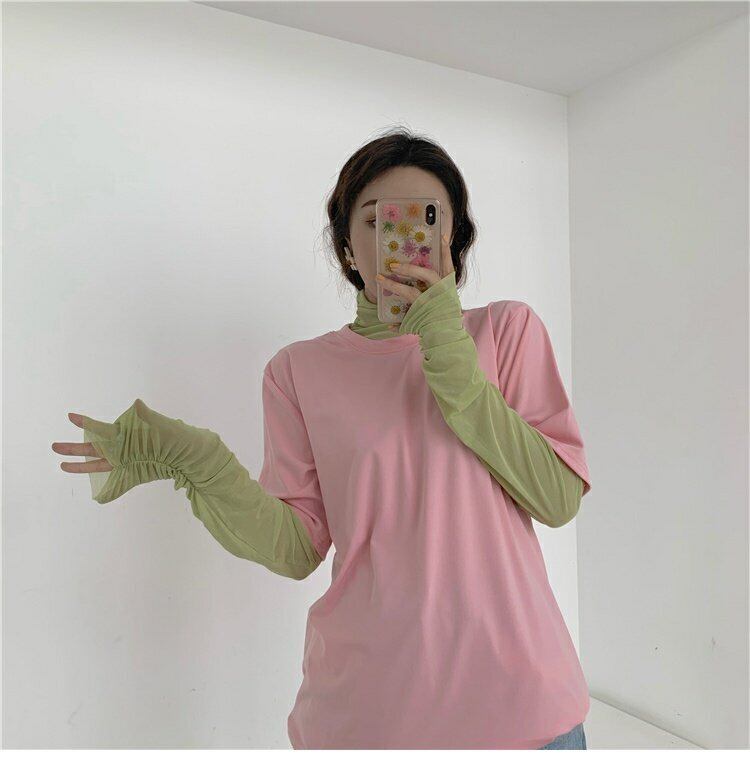 スプリングオータムスタイルカラーメッシュプリーツスリーブトップス ルーズTシャツ レッド 春物 秋物 ピュア ドラファッションホール16321350385