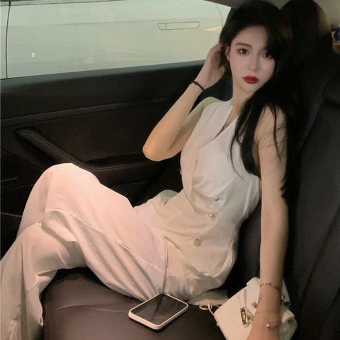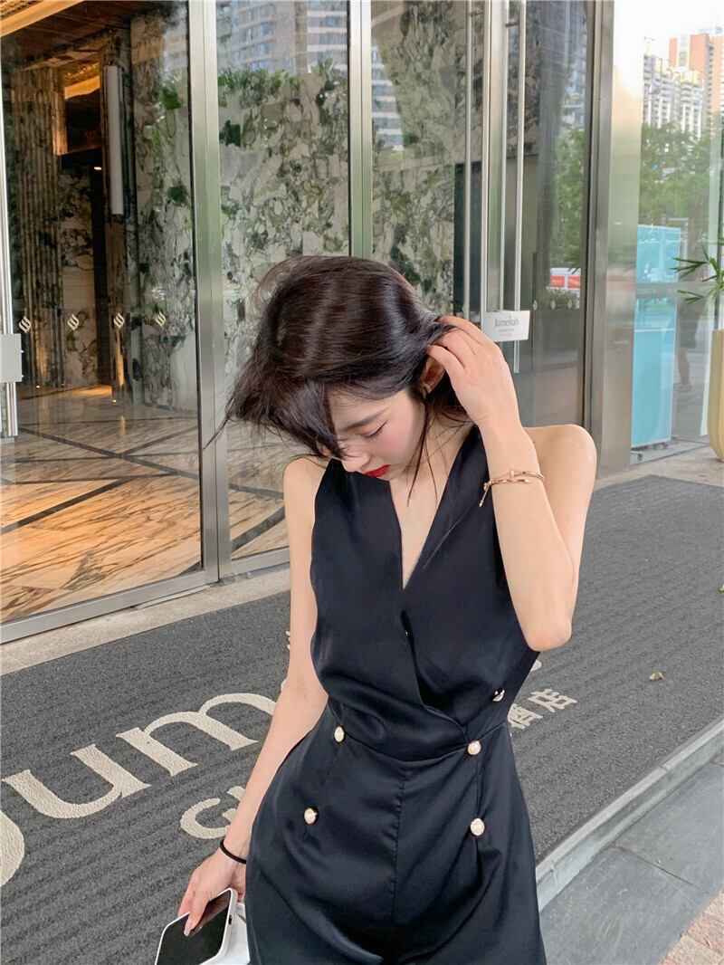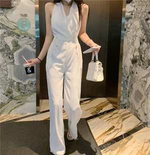 スタンダードVネックダブルブレストノースリーブハイウェストロングジャンプスーツ オールインワン レディース レトロ エレガント ドラファッションホール78631996554