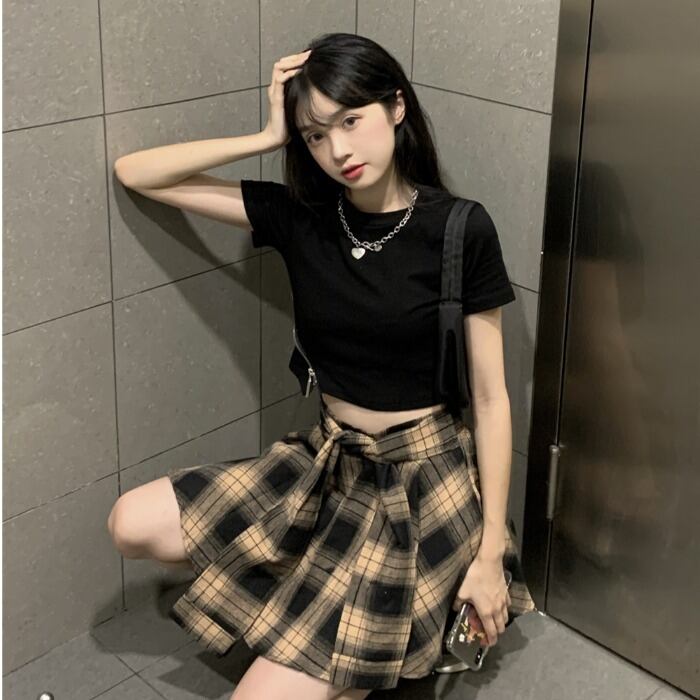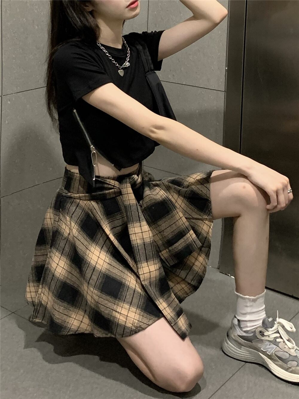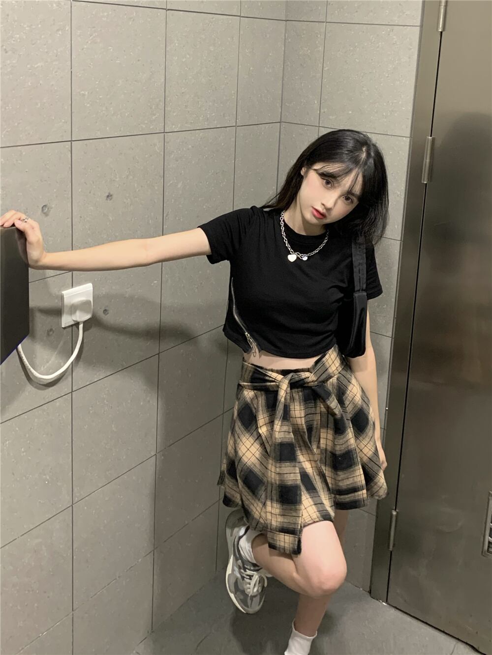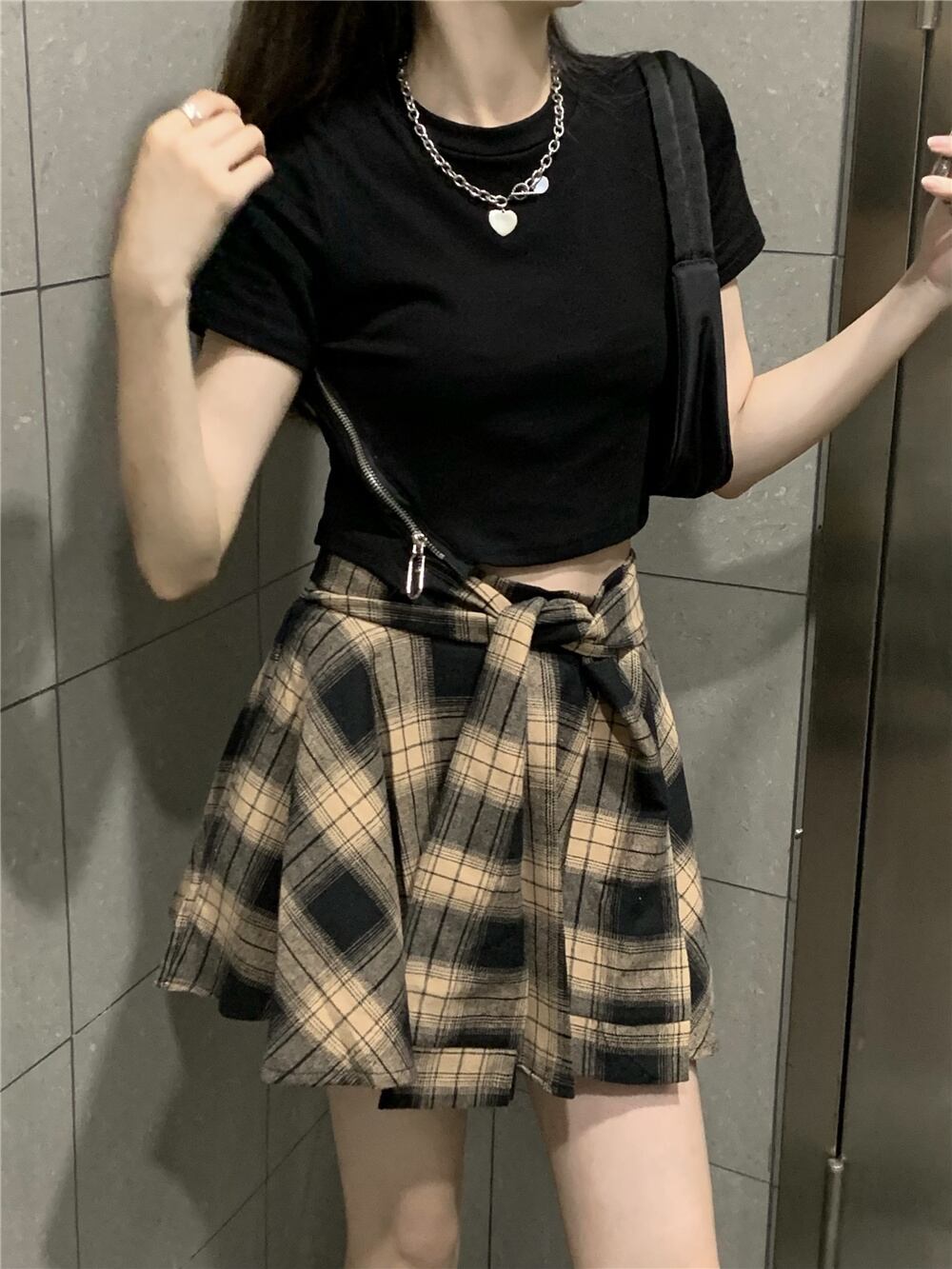 スリムショートジッパーTシャツ トップス ハイウェスト格子柄レーススカート レディース ストリート ドラファッションホール25499546360