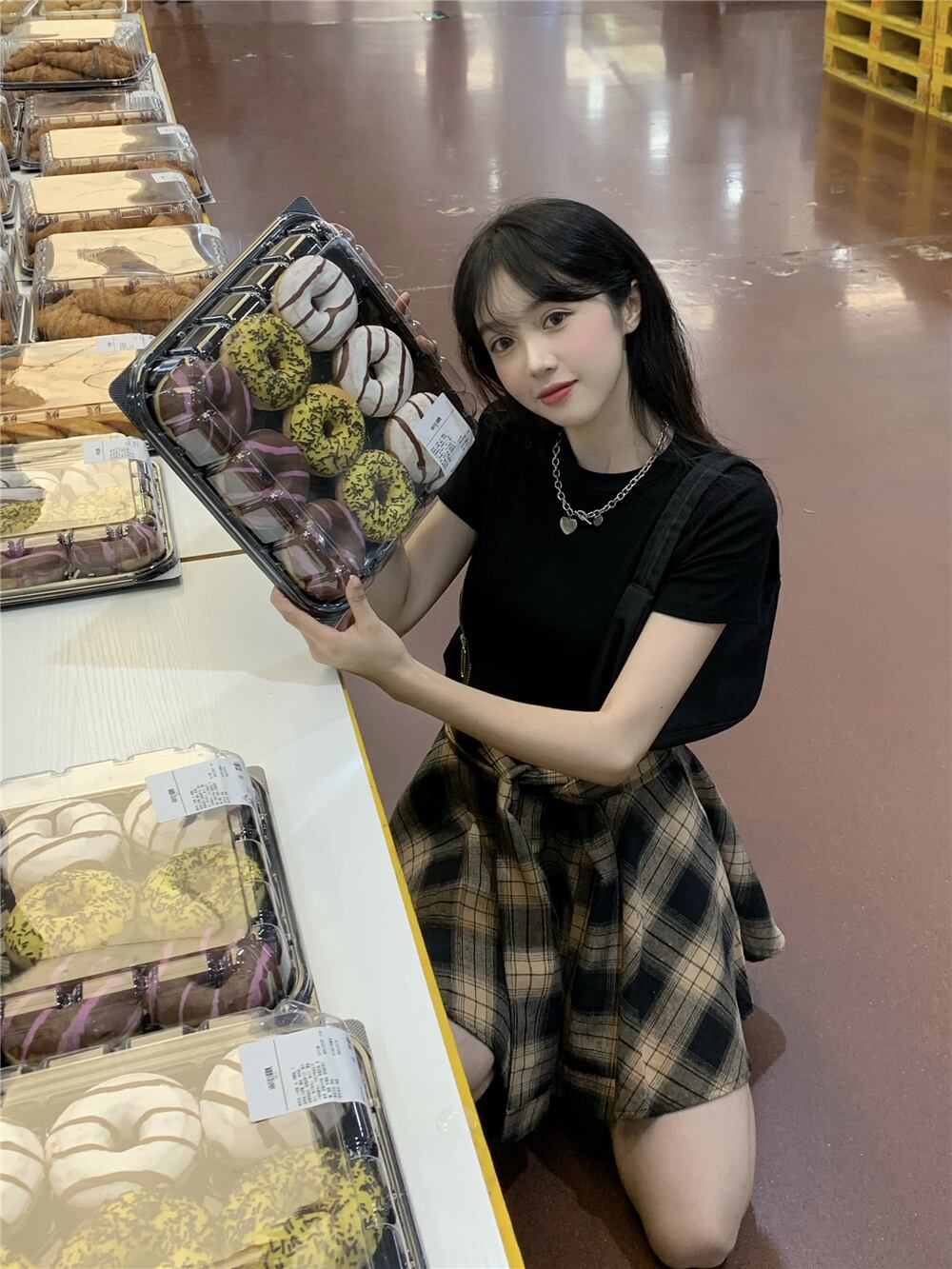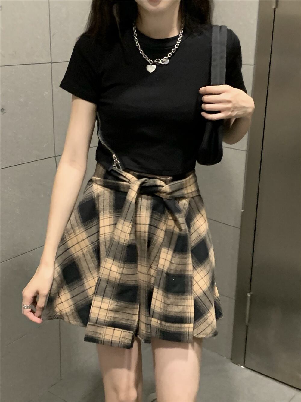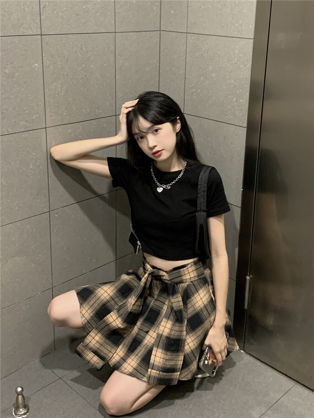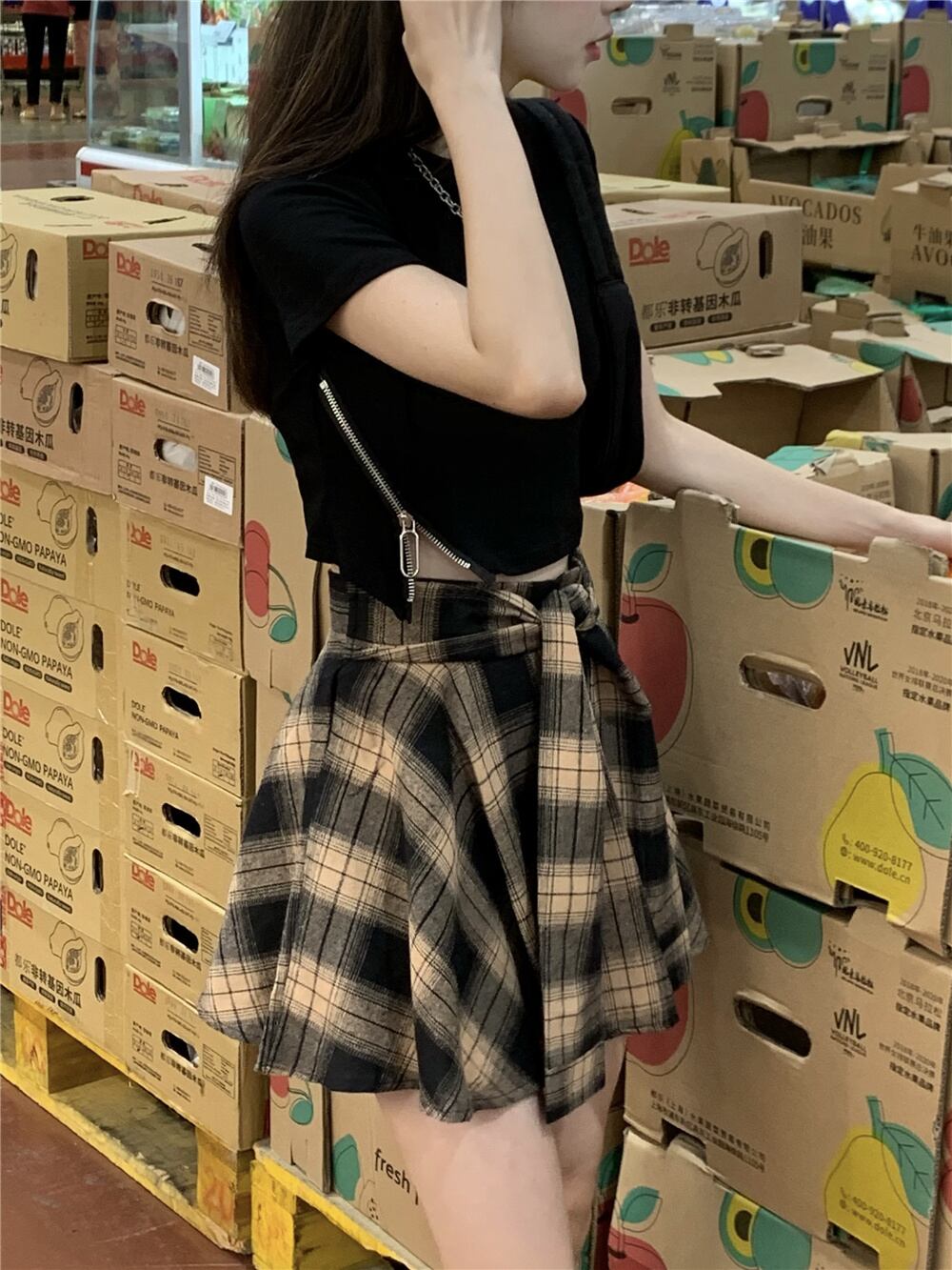 スリムショートジッパーTシャツ トップス ハイウェスト格子柄レーススカート レディース ストリート ドラファッションホール25499546360