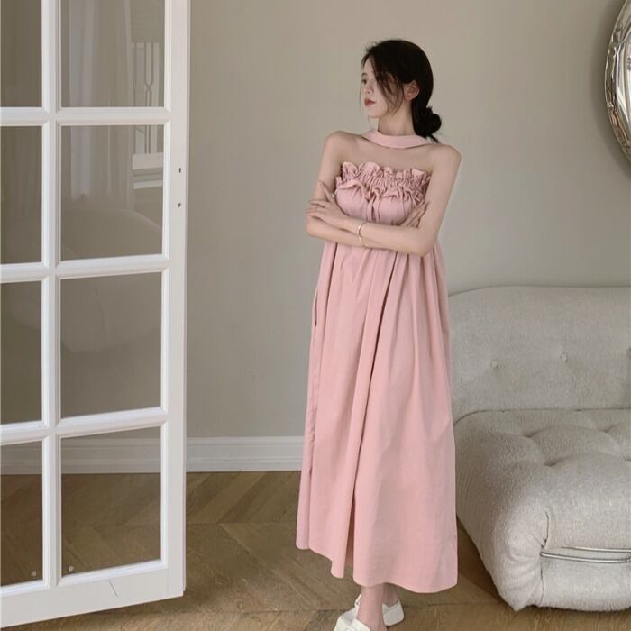 スタンダードスタイルホルターレーストップス ロングスカート サマードレス レトロ 夏物 ドラファッションホール23312463499