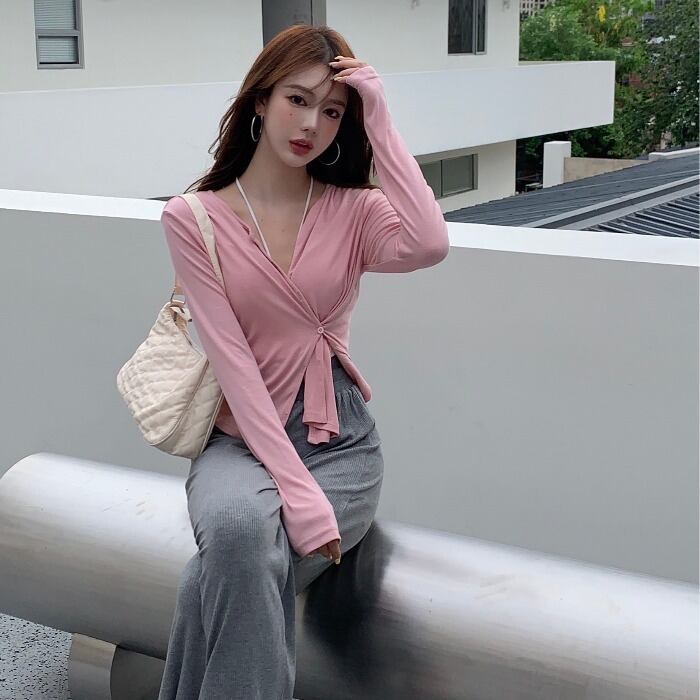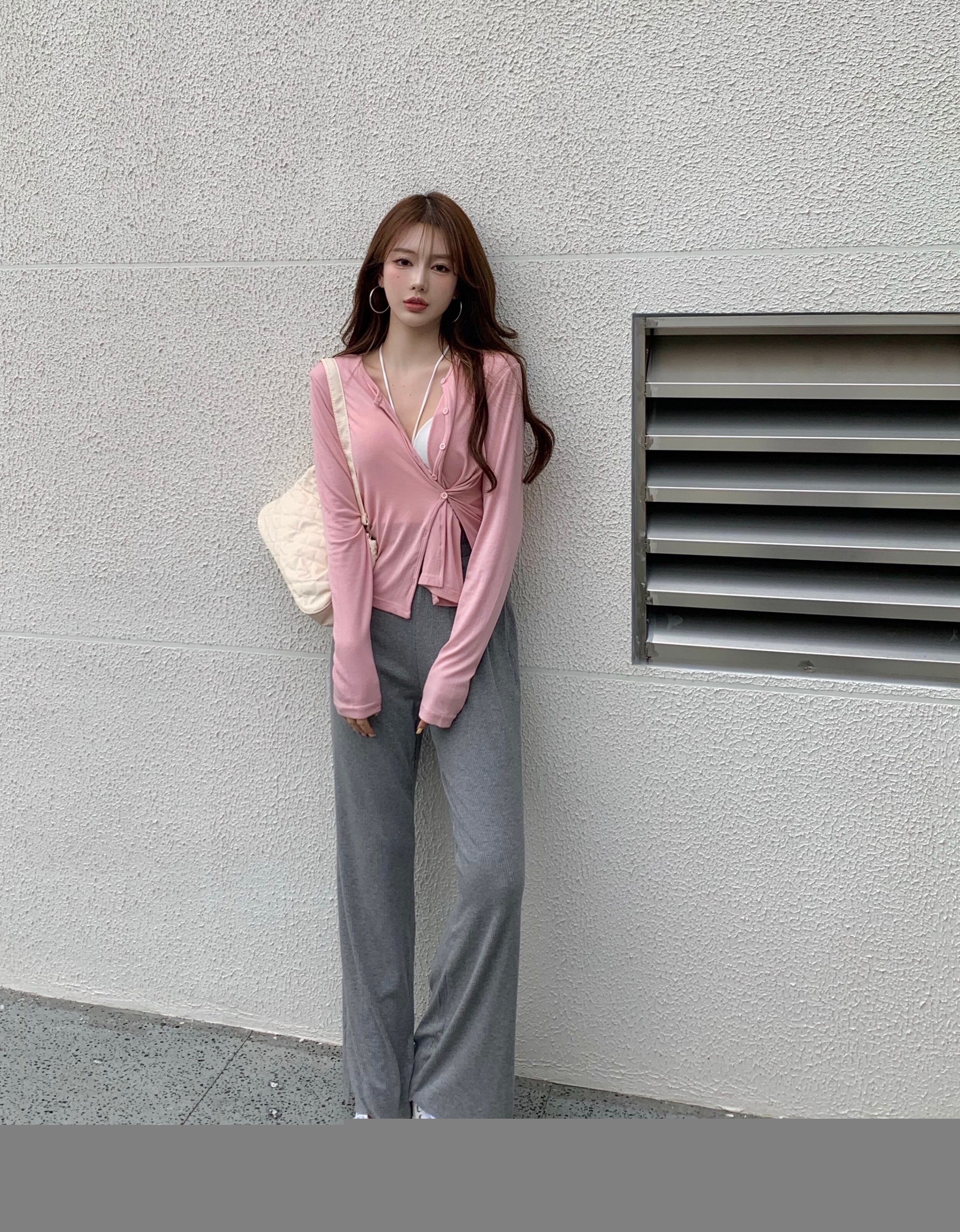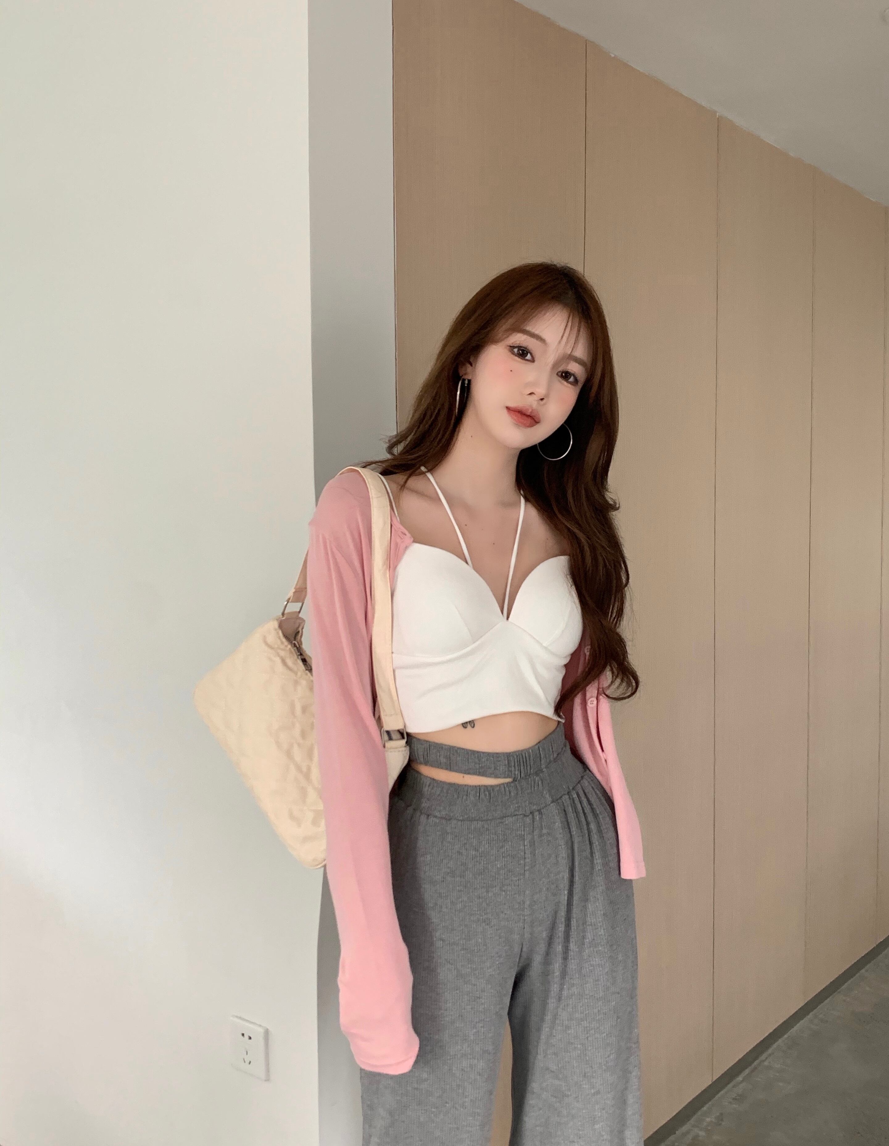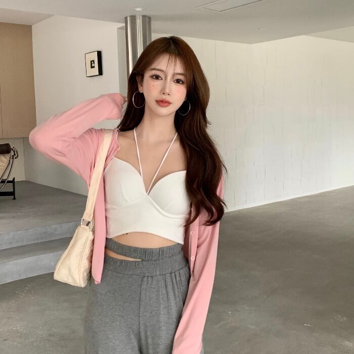色:ホワイトサスペンダー,ピンクのカーディガン,グレーパンツ