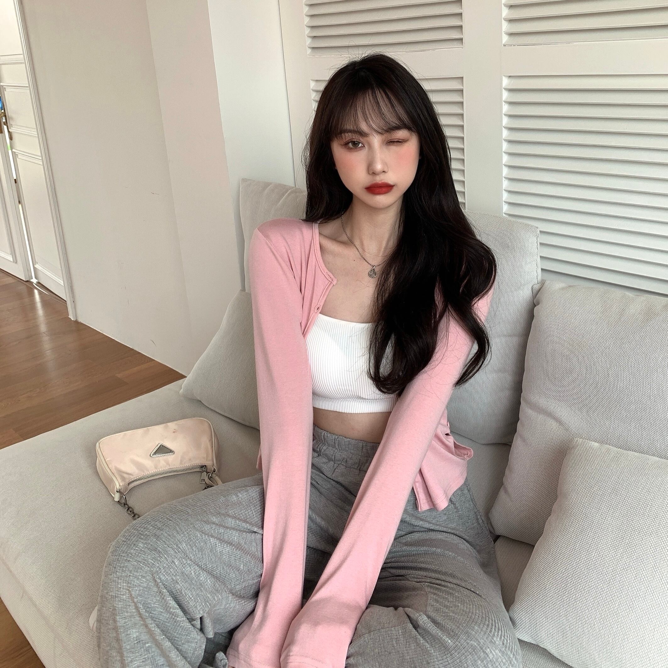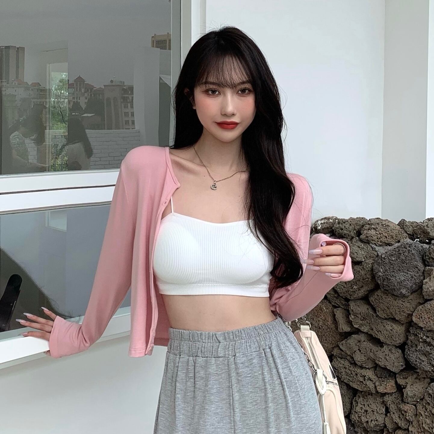 色:白いチューブトップ,ピンクのカーディガン,グレーパンツ