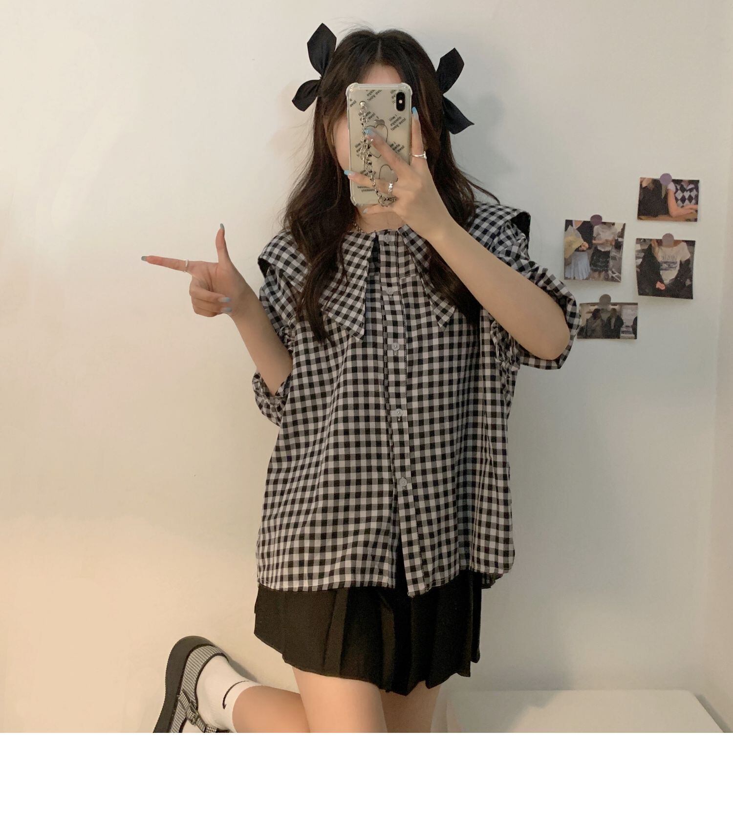 カラーギャザーカジュアルシャツ サマー薄手ルーズ格子柄 夏物 ドラファッションホール88935360481