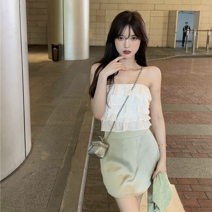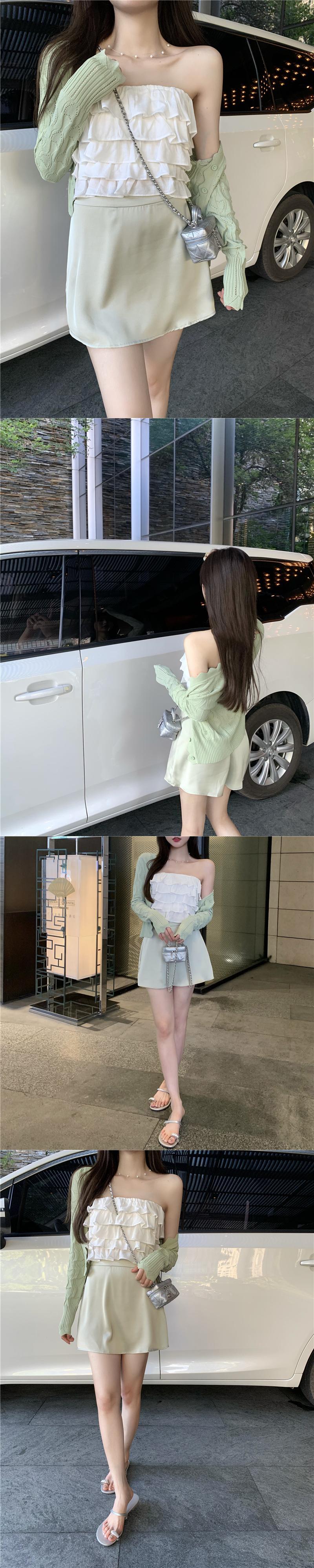 色:白いチューブトップ,緑のスカート,グリーンカーディガン