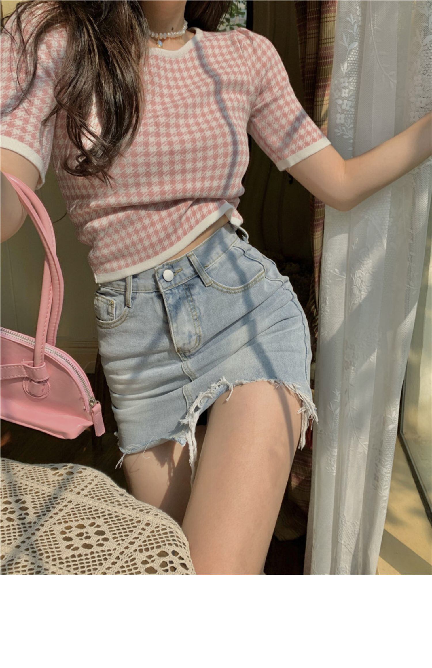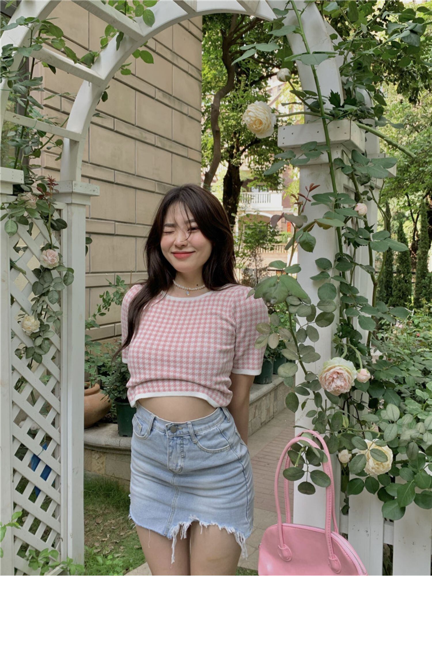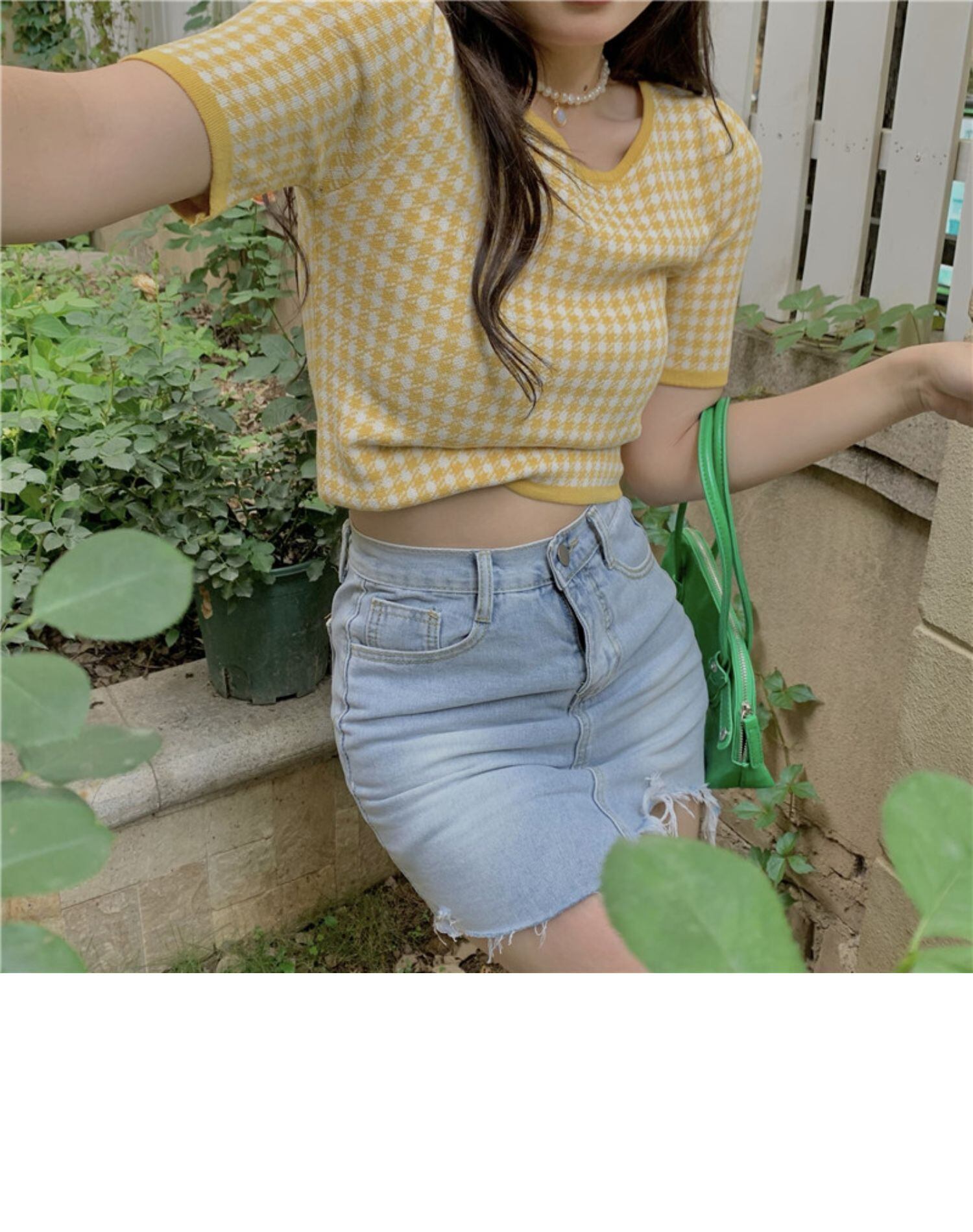 サマースタンダード格子柄ショート薄手ニットセーター レッドトップス レディース レトロ 大人ガーリー スウィート キュート カジュアル 夏物 ドラファッションホール1396966852