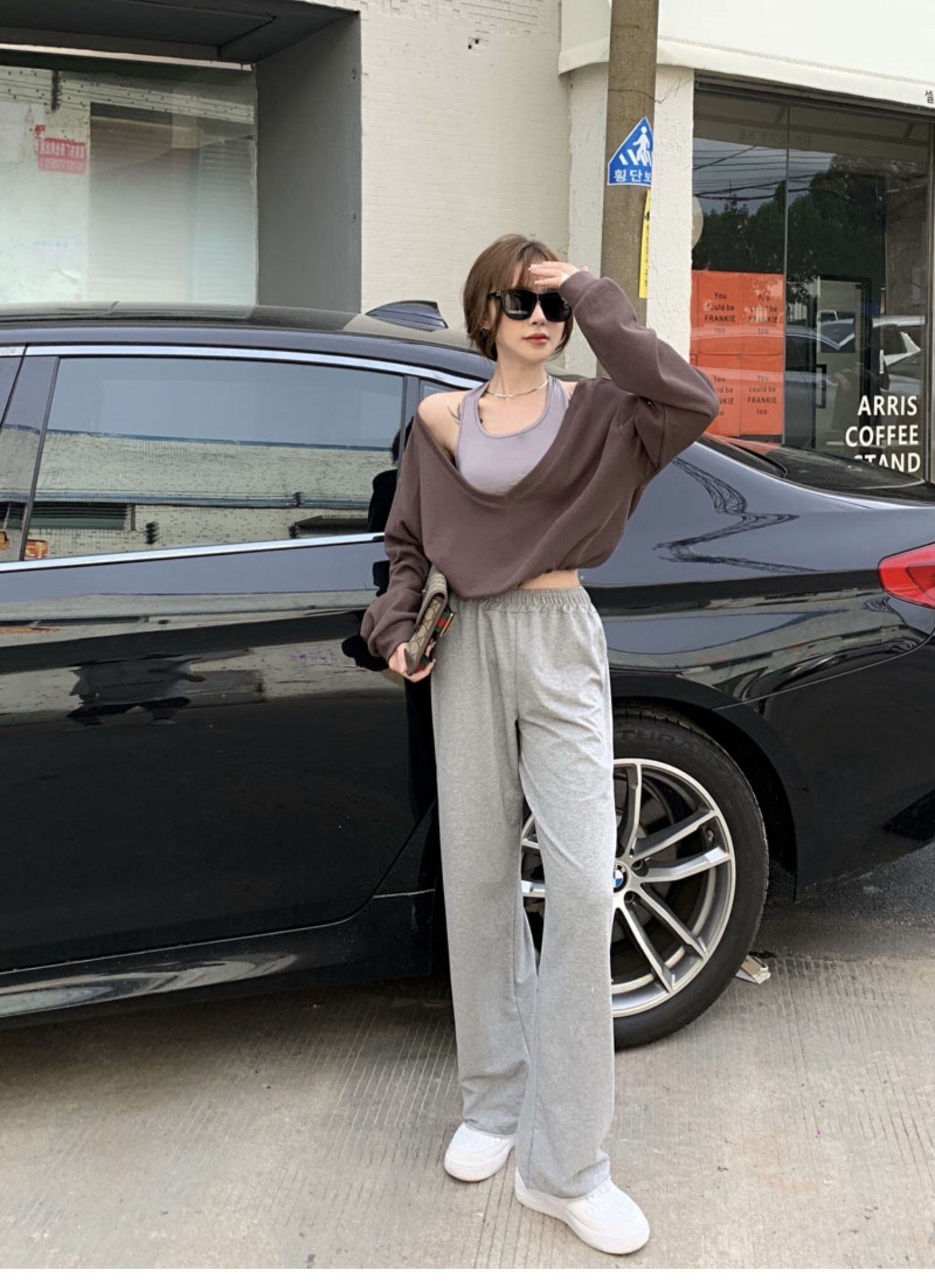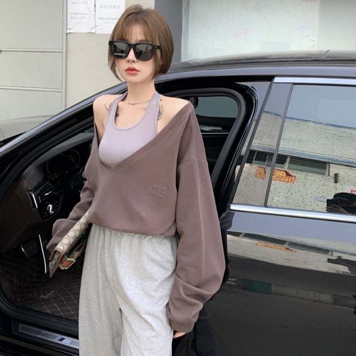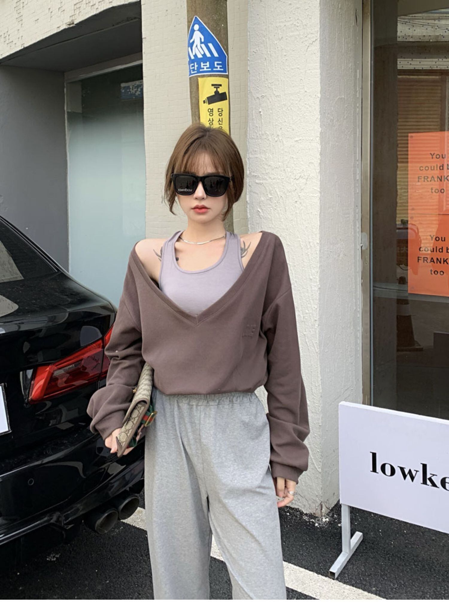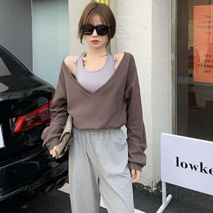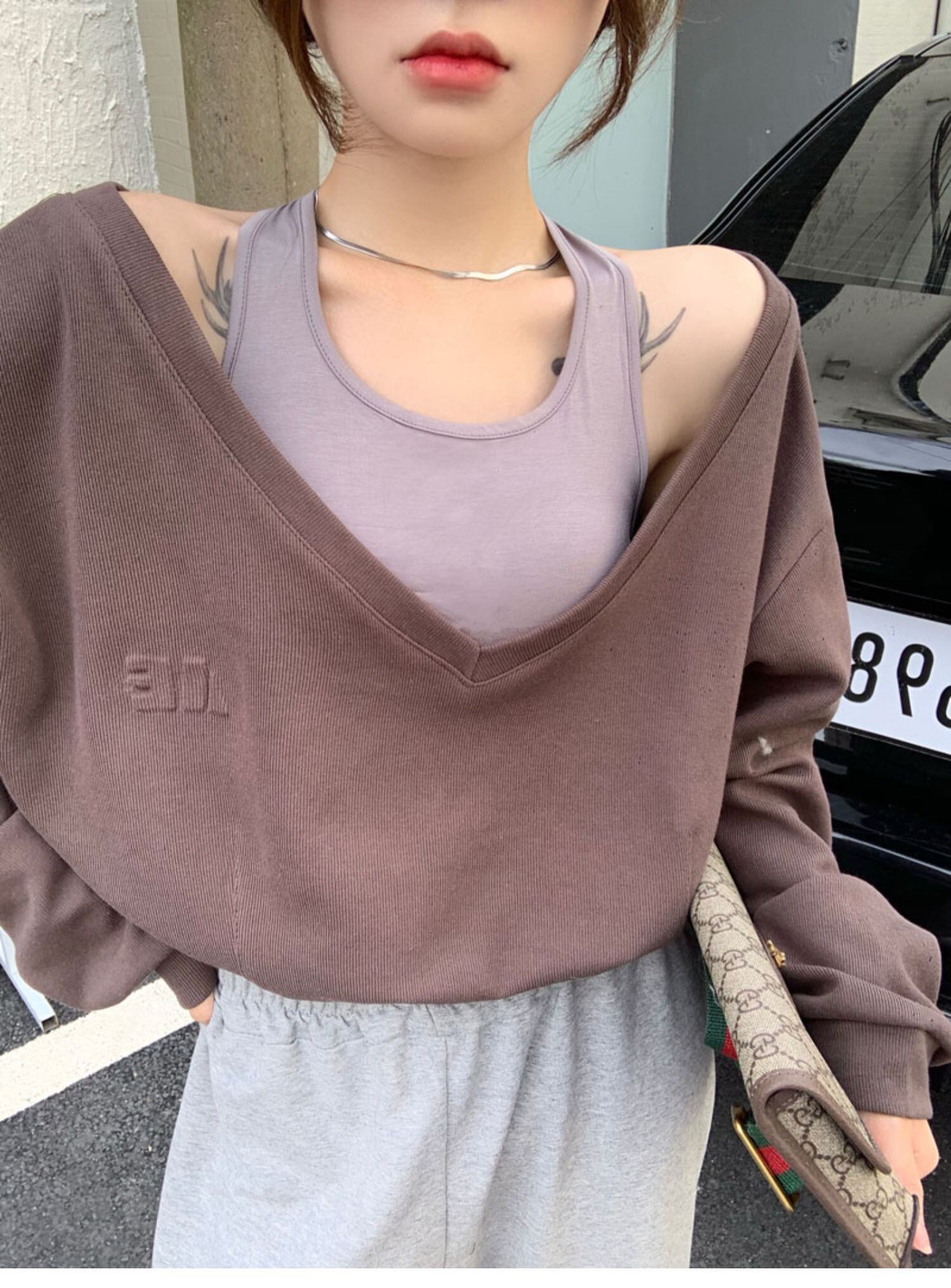 オータムスタンダードVネックホルターショートレッドトップス ルーズTシャツ レディース ロング レトロ 秋物 ドラファッションホール5114161527