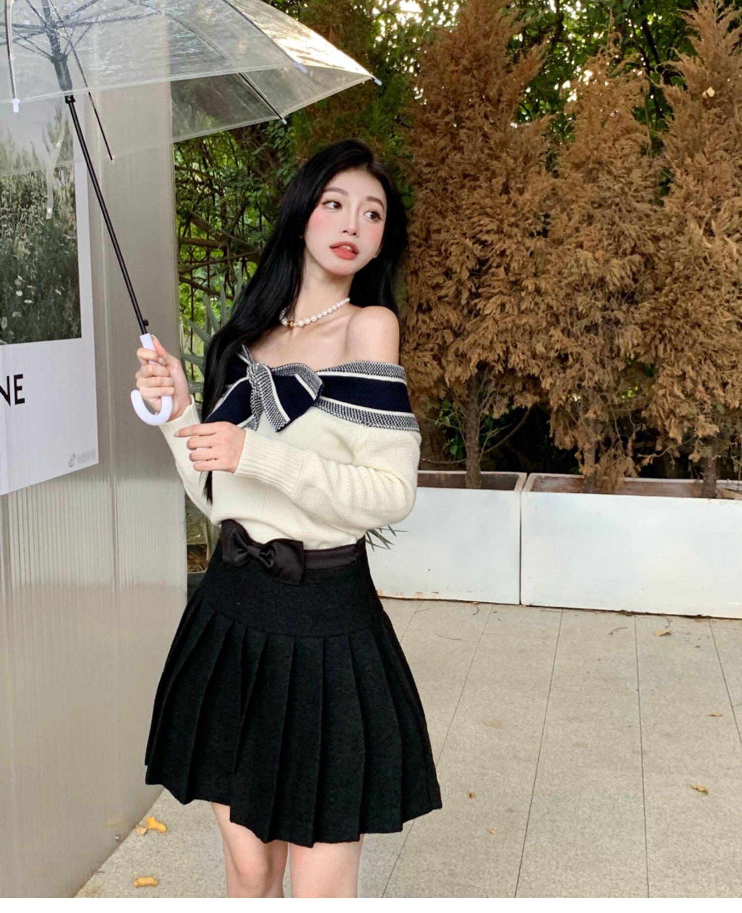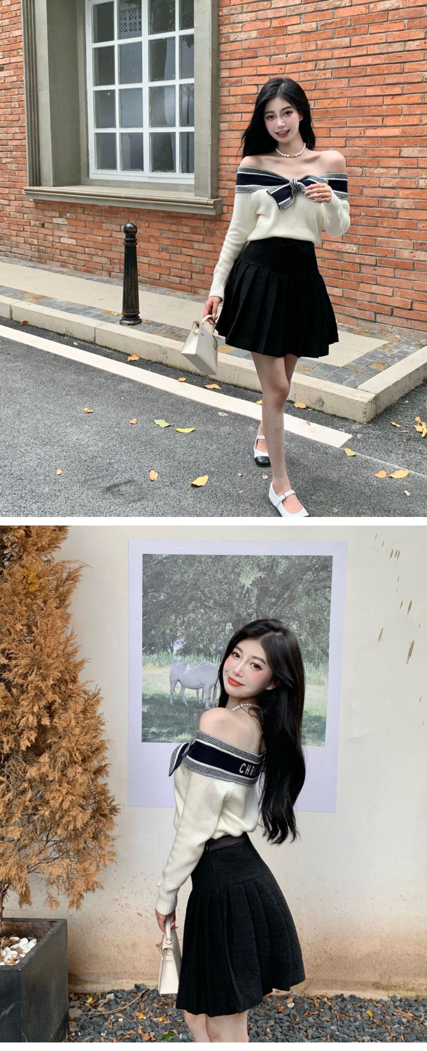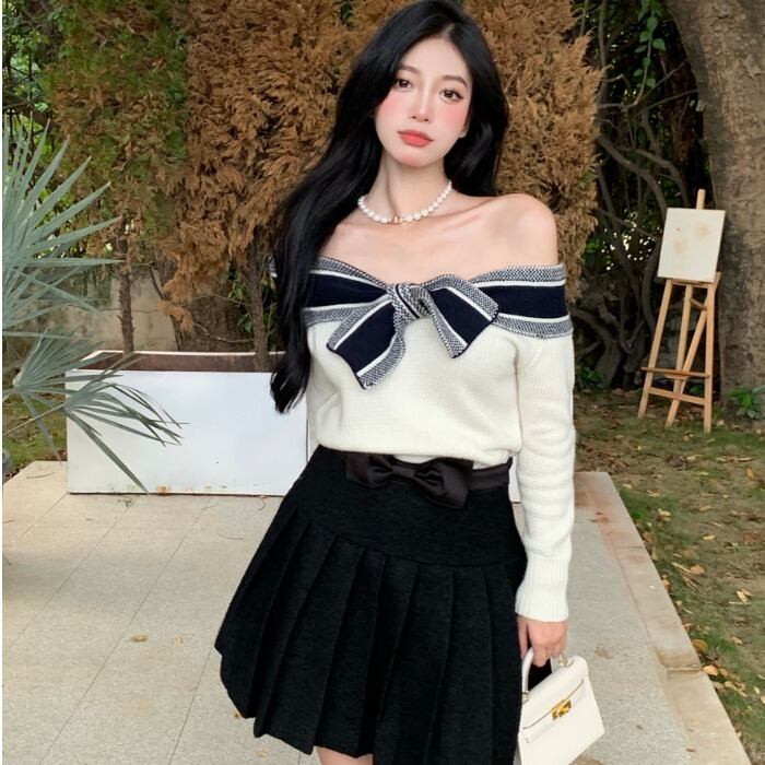 オータムネイビースタイルニットセーター プリーツスカート レディース 秋物 ドラファッションホール72085073701