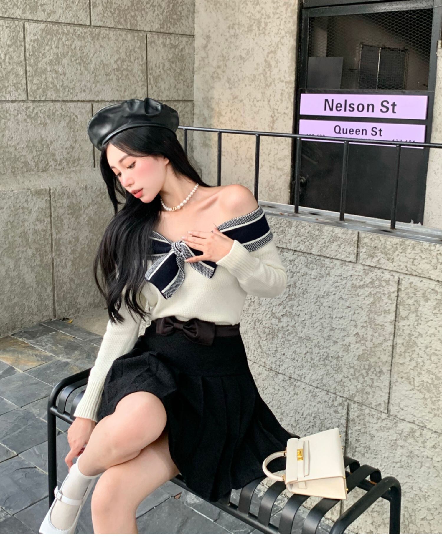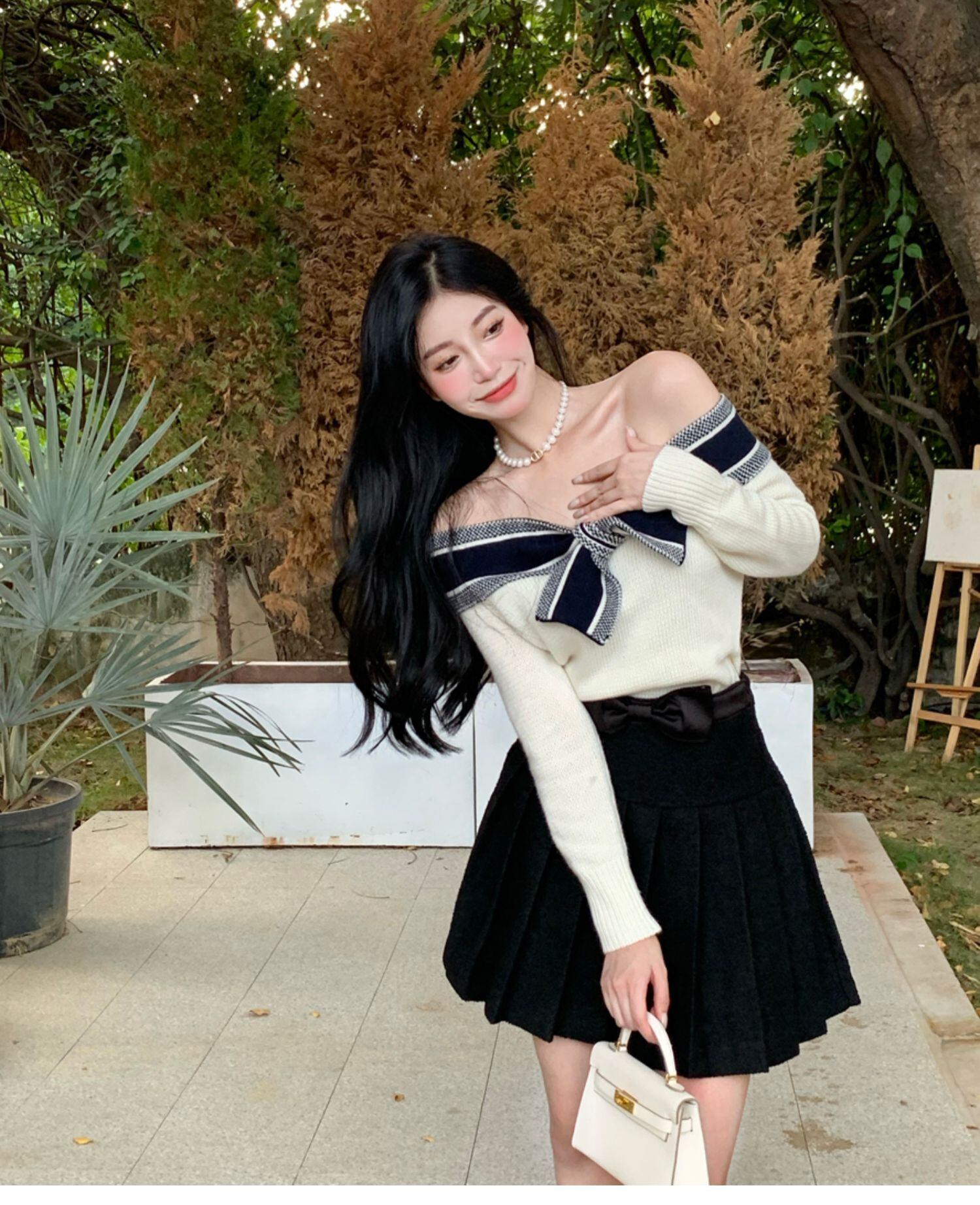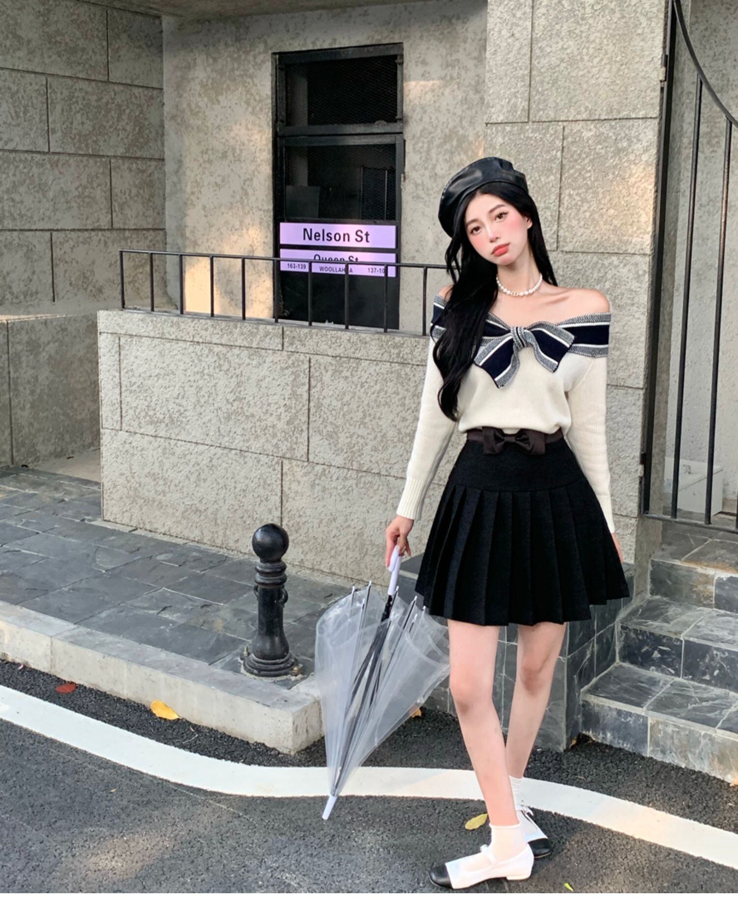 オータムネイビースタイルニットセーター プリーツスカート レディース 秋物 ドラファッションホール72085073701