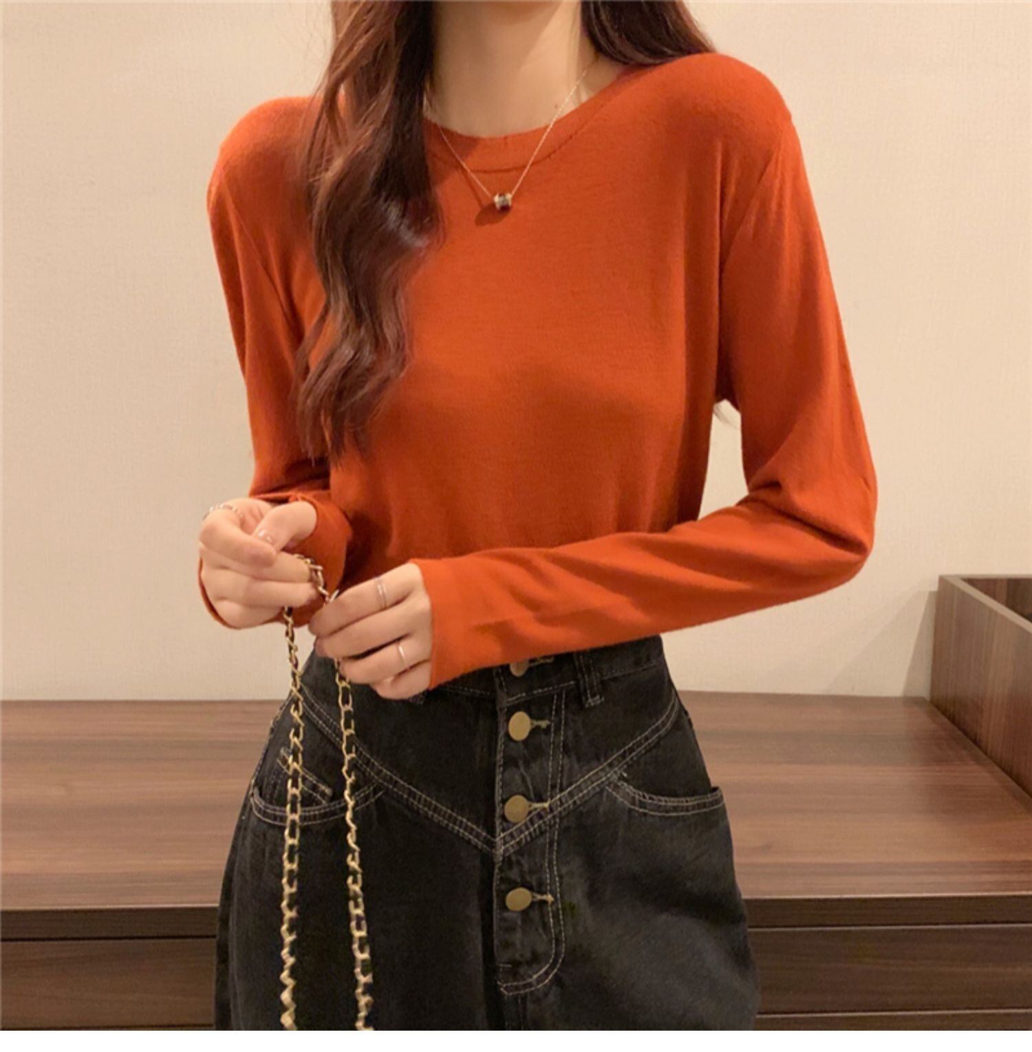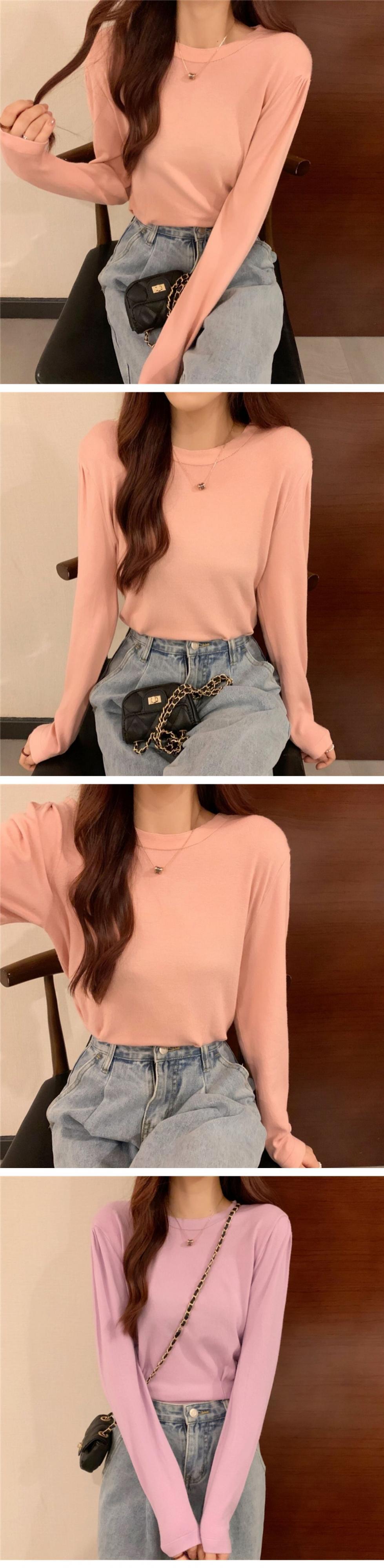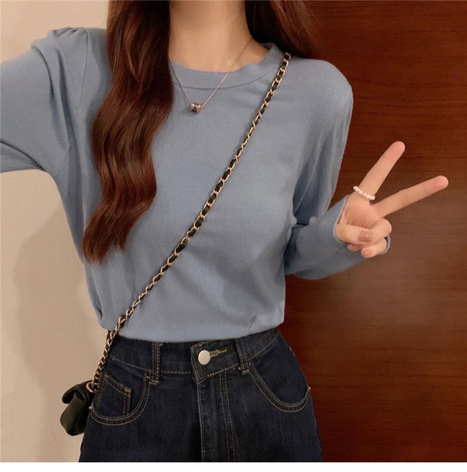 オータムスリムラウンドネックプルオーバー ニットシャツ カジュアルトップス Tシャツ レディース ロング 秋物 Oネック ドラファッションホール14257117657