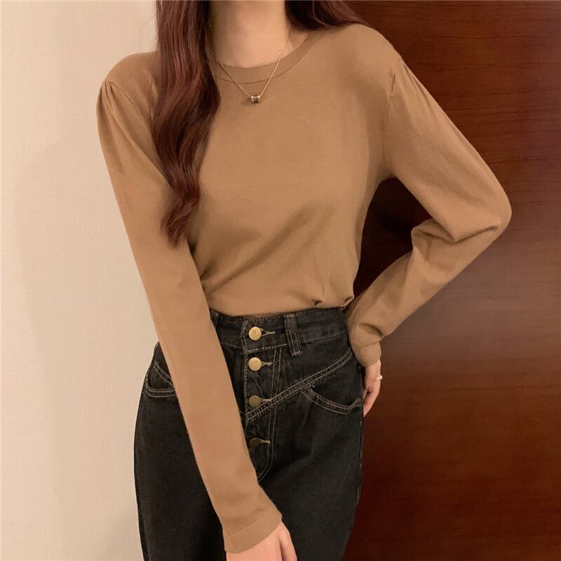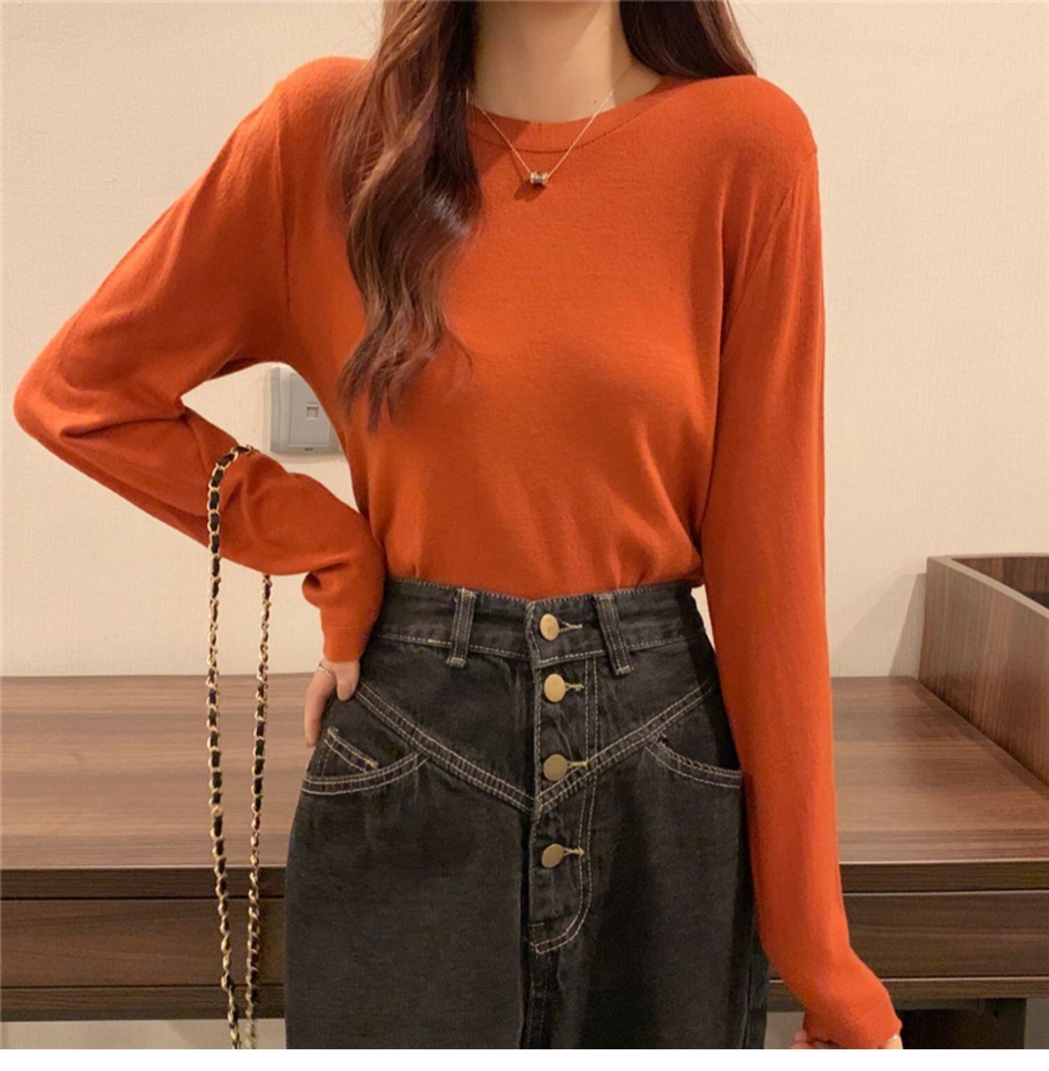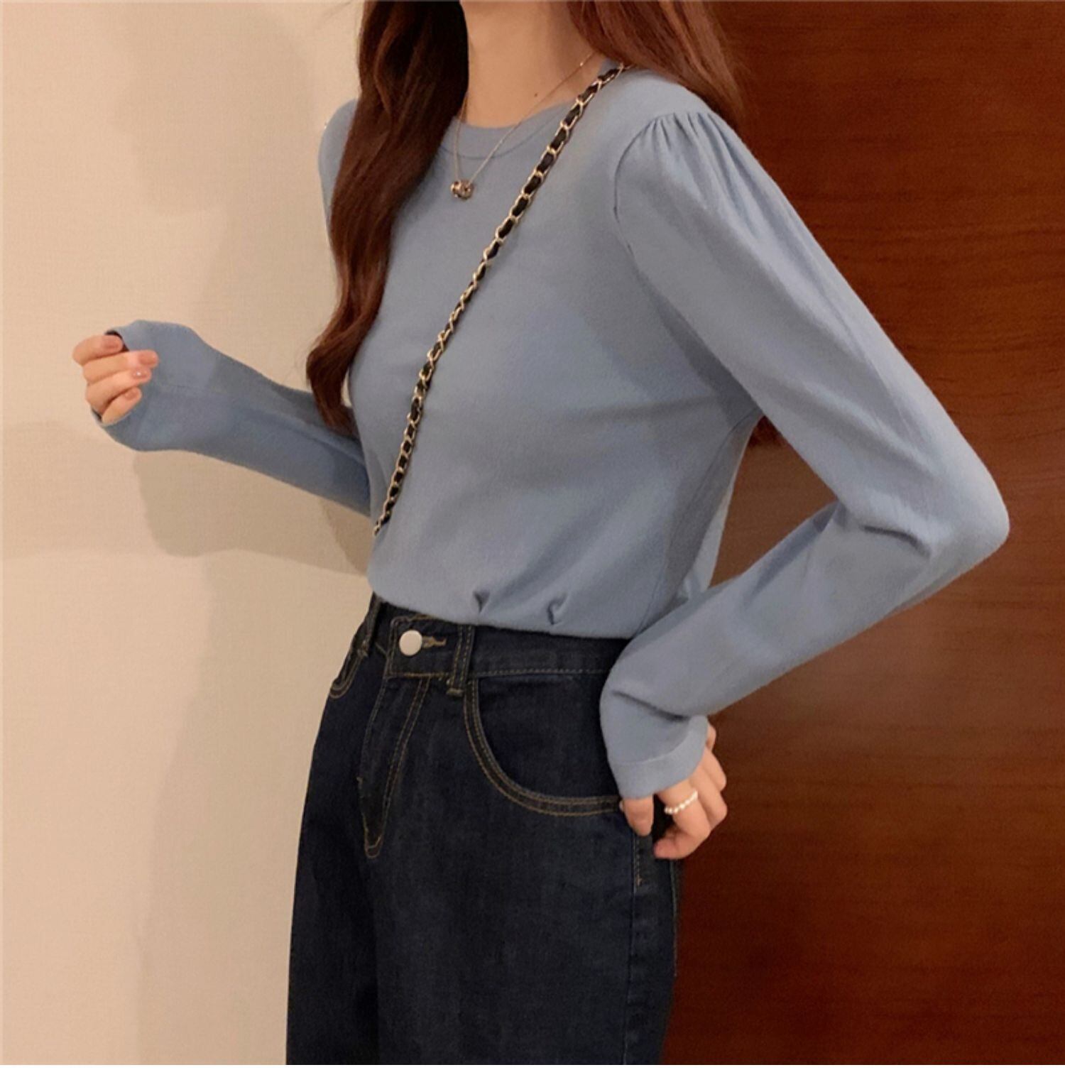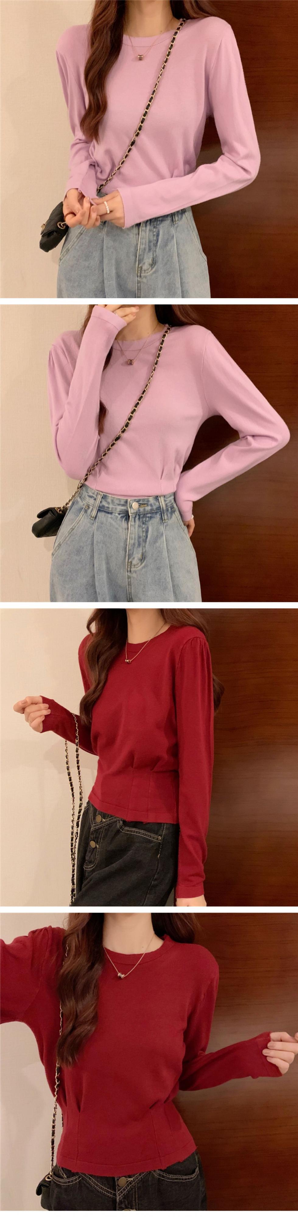 オータムスリムラウンドネックプルオーバー ニットシャツ カジュアルトップス Tシャツ レディース ロング 秋物 Oネック ドラファッションホール14257117657