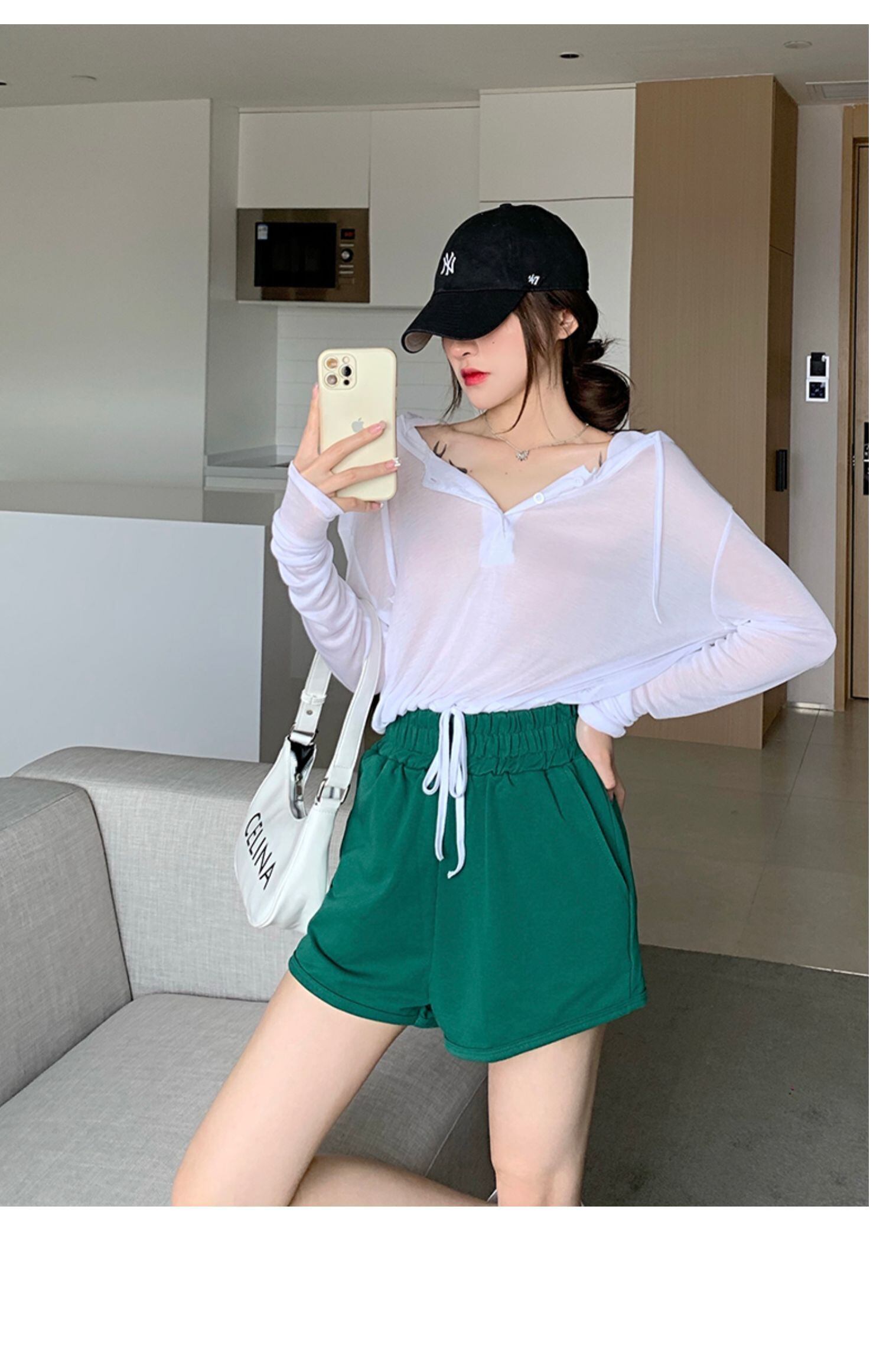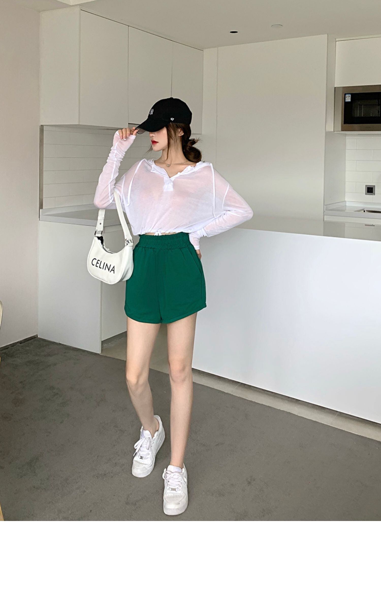 色:グレーグリーンシャツ8115,ホワイトトップ8115,黒のショートパンツ8116,グリーンショーツ8116