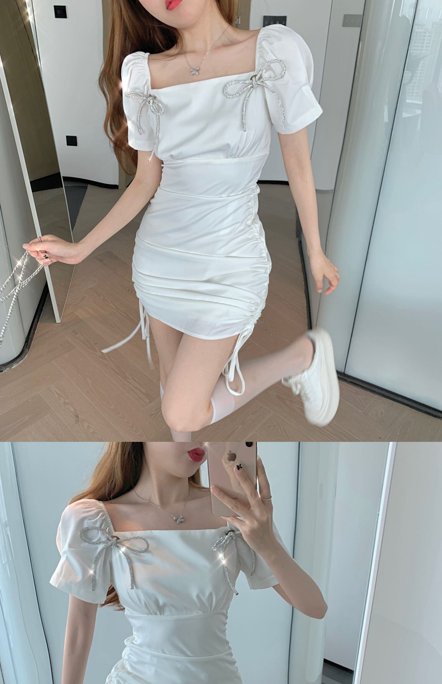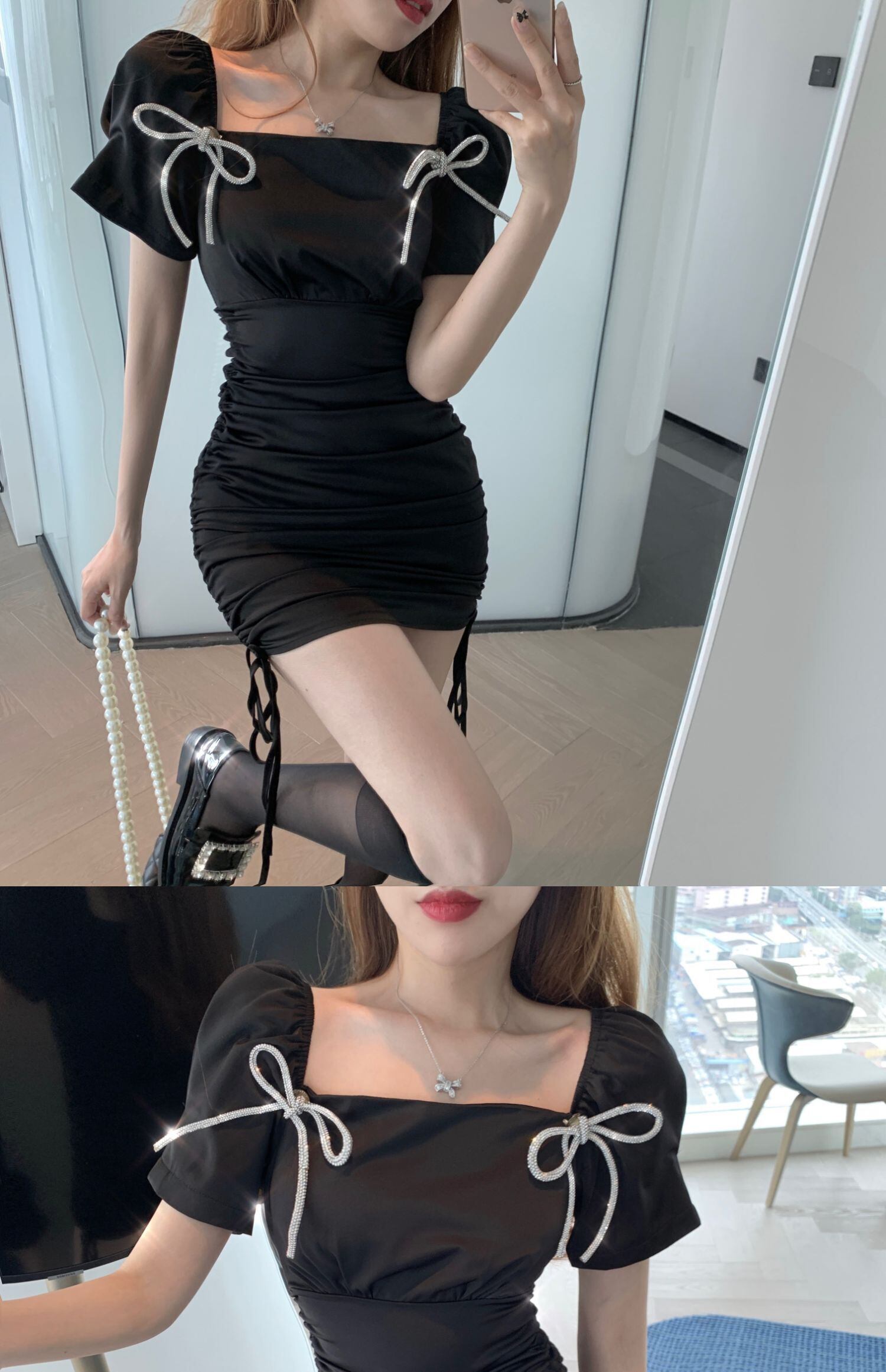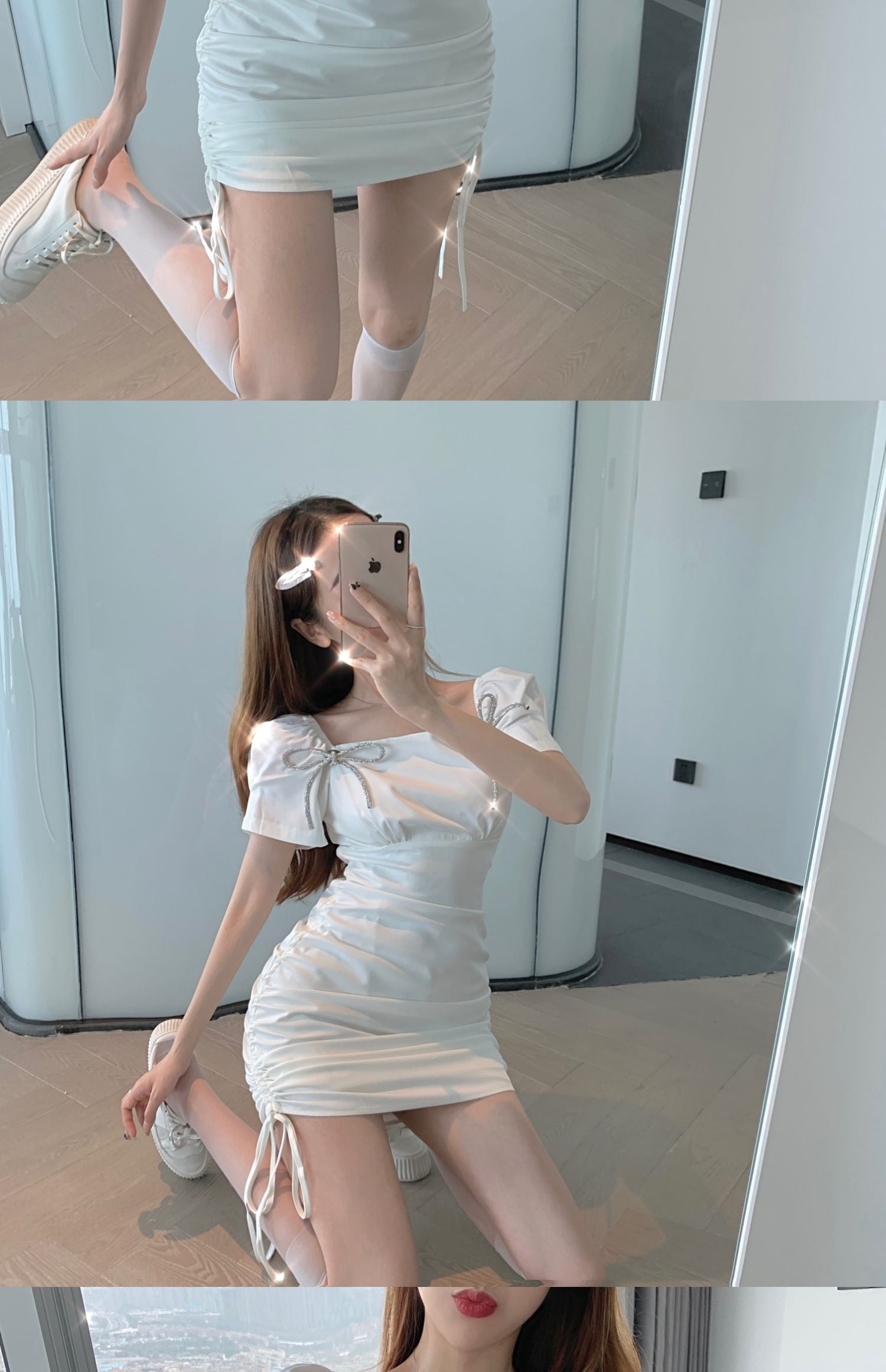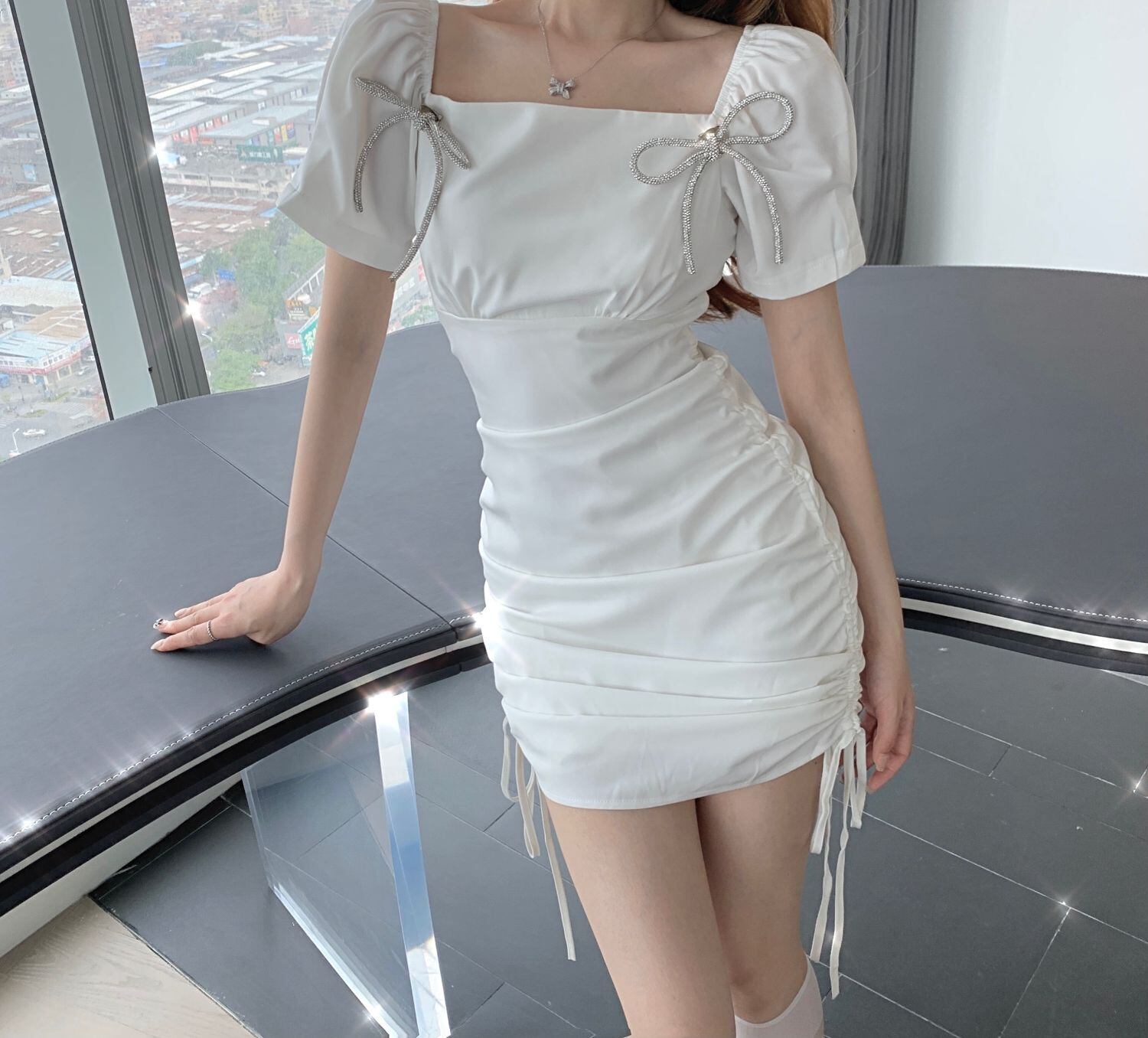 スタンダードサマースタイルスリーブスリムドレス リボン レトロ 夏物 スリムヒップ スクウェア ドラファッションホール42741605899