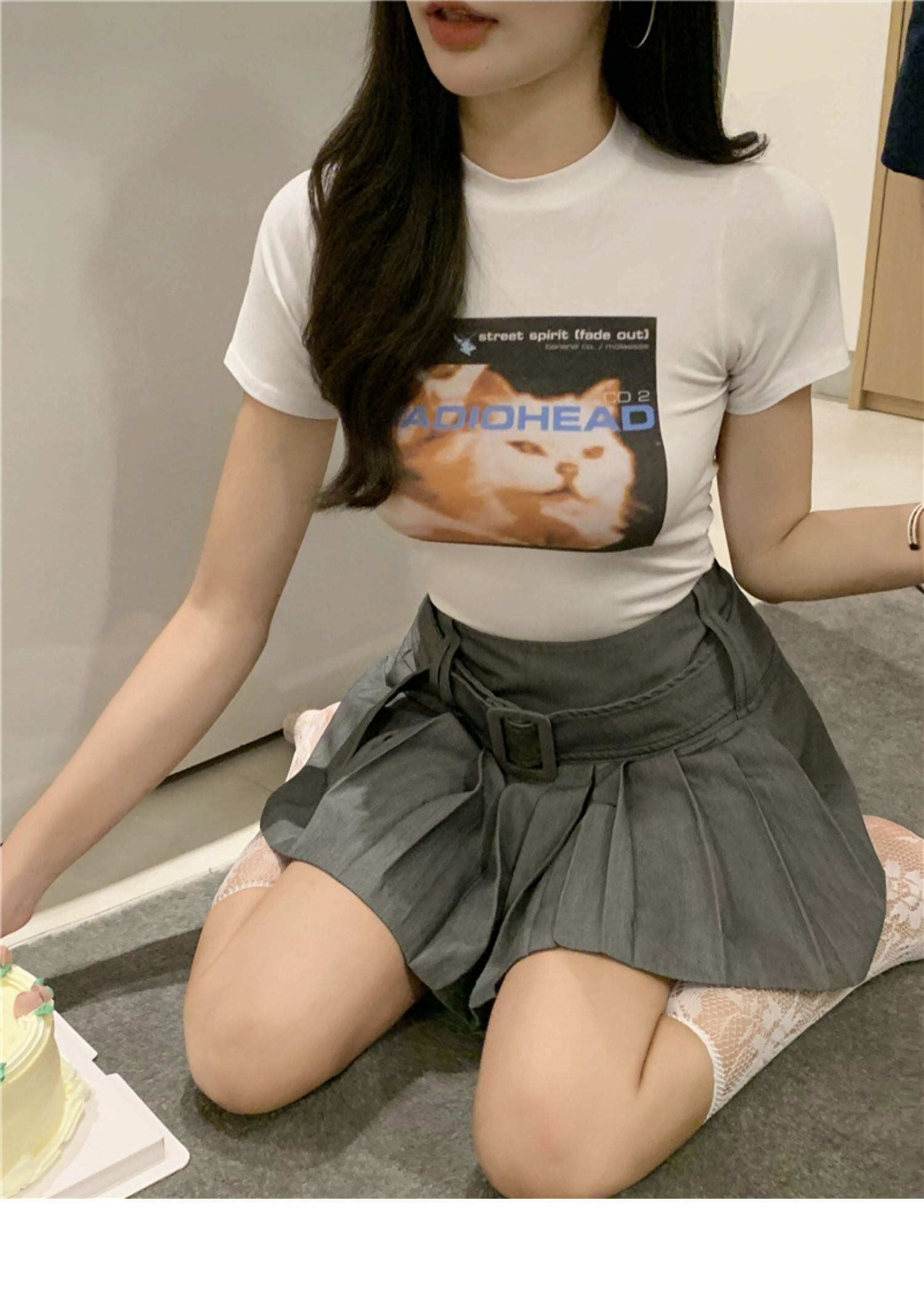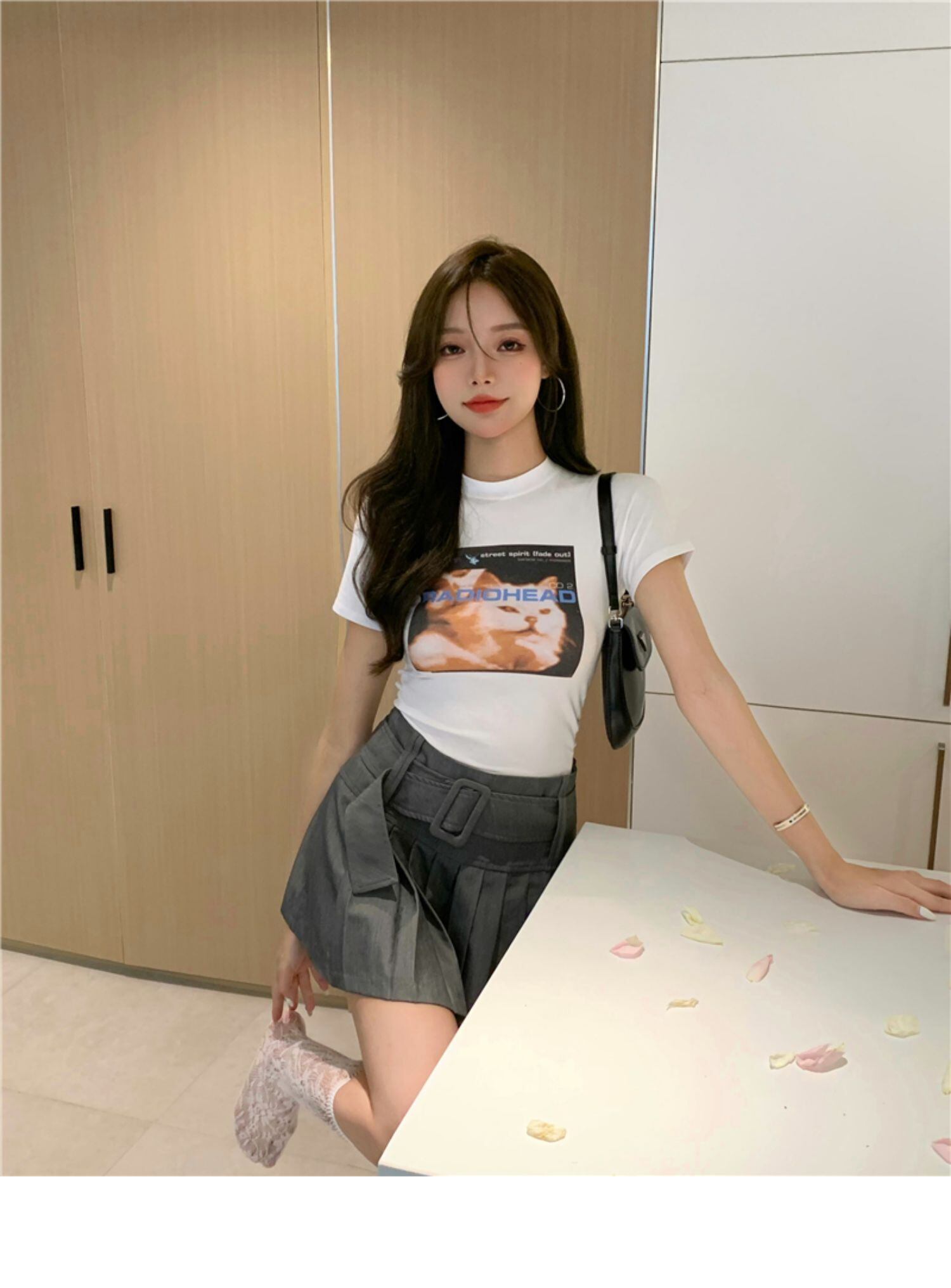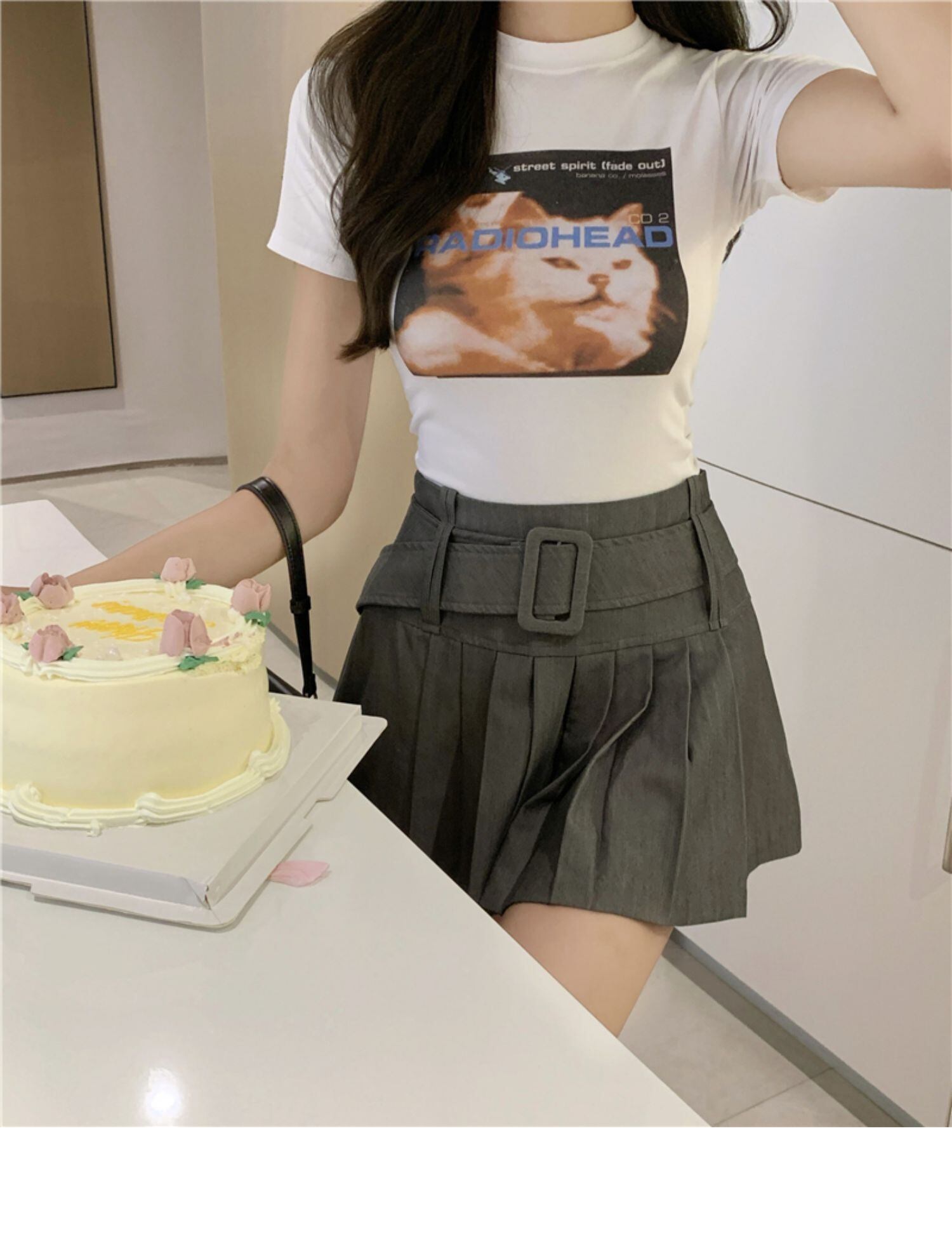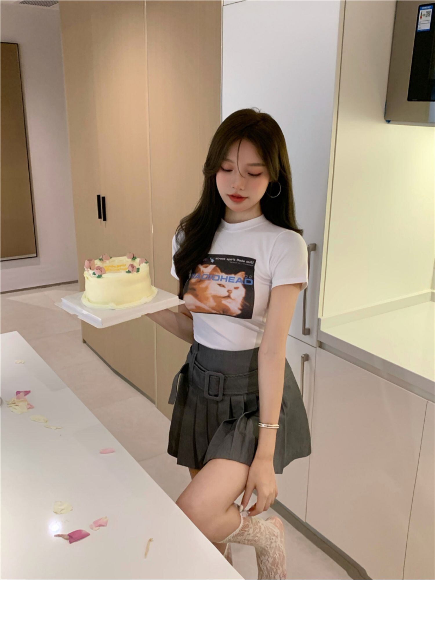 ラウンドネックショートプリント柄半袖スリーブスタイル薄手ベルト プリーツスカート カジュアルサマー ハーフスリーブ 夏物 ハーネス Oネック ドラファッションホール49288113268